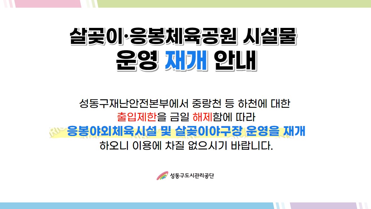 살곶이 · 응봉체육공원 시설물 운영 재개 안내 작성자 관리자 등록일자 2023년 8월 24일 9시 34분 6초 조회 566 재개 안내문.jpg [ Size : 106.79KB , Down : 389 ] 미리보기 다운로드 목록보기