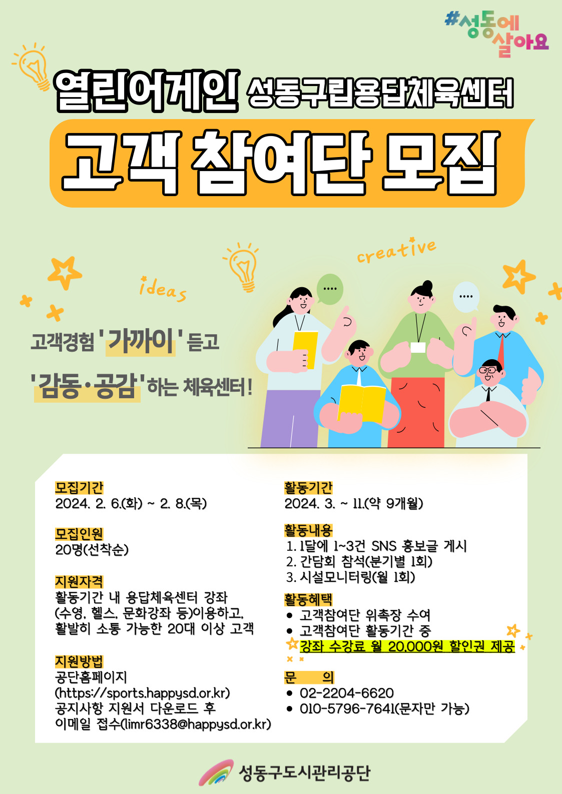 [용답체육센터] 2024년 용답체육센터 열린어게인 고객참여단 모집 작성자 관리자 등록일자 2024년 2월 6일 16시 35분 46초 조회 781 2024 용답 고객참여단 홍보물.jpg [ Size : 351.17KB , Down : 626 ] 미리보기 다운로드 2024년 용답체육센터 고객참여단 지원서.hwp [ Size : 24.5KB , Down : 446 ] 다운로드 목록보기