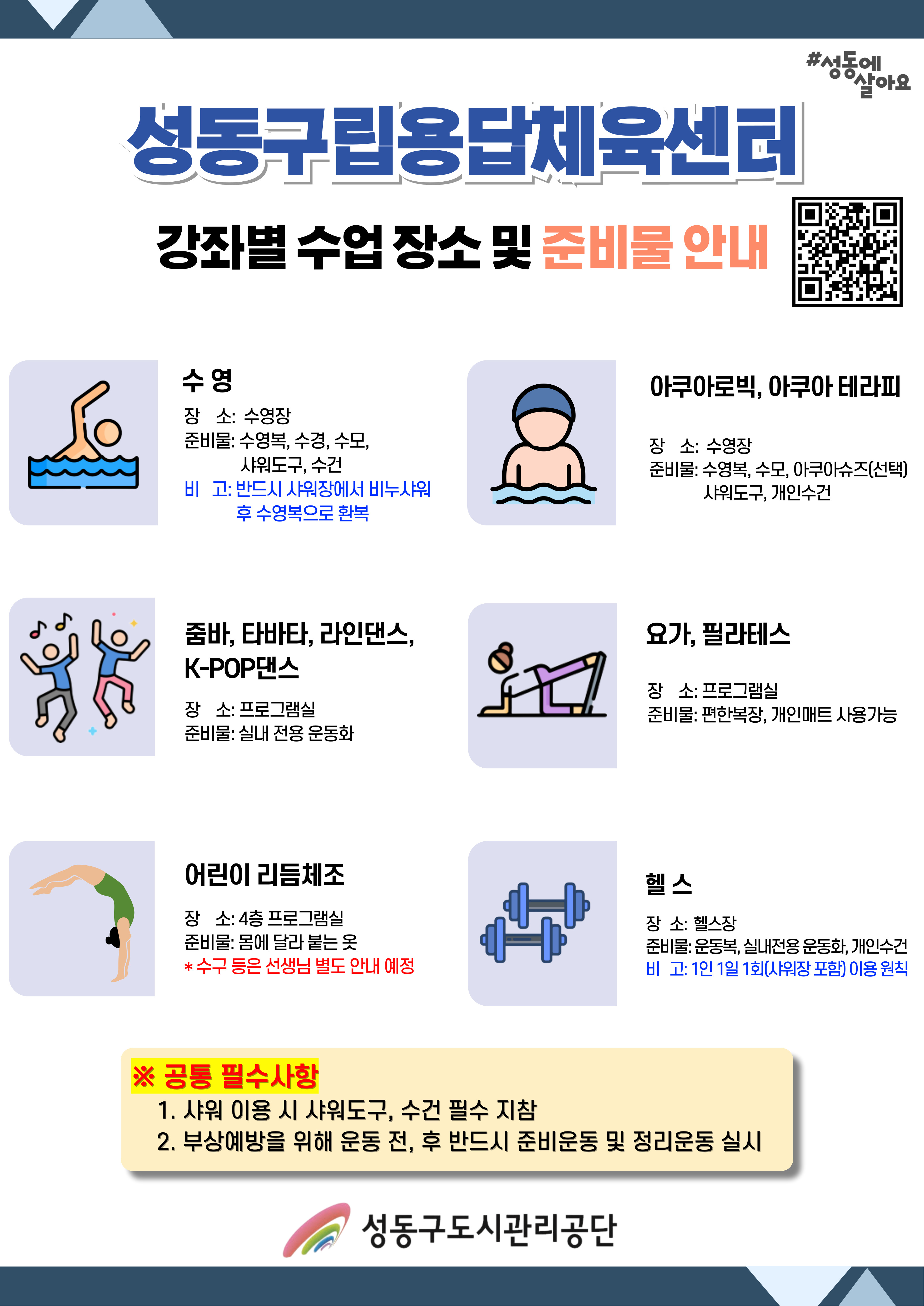 공지 성동구립용답체육센터 강좌별 수업 장소 및 준비물 안내 작성자 관리자 등록일자 2025년 7월 11일 16시 52분 43초 조회 738 용답_-준비물-및-안전수칙.jpg [ Size : 1.21MB , Down : 125 ] 미리보기 다운로드 목록보기