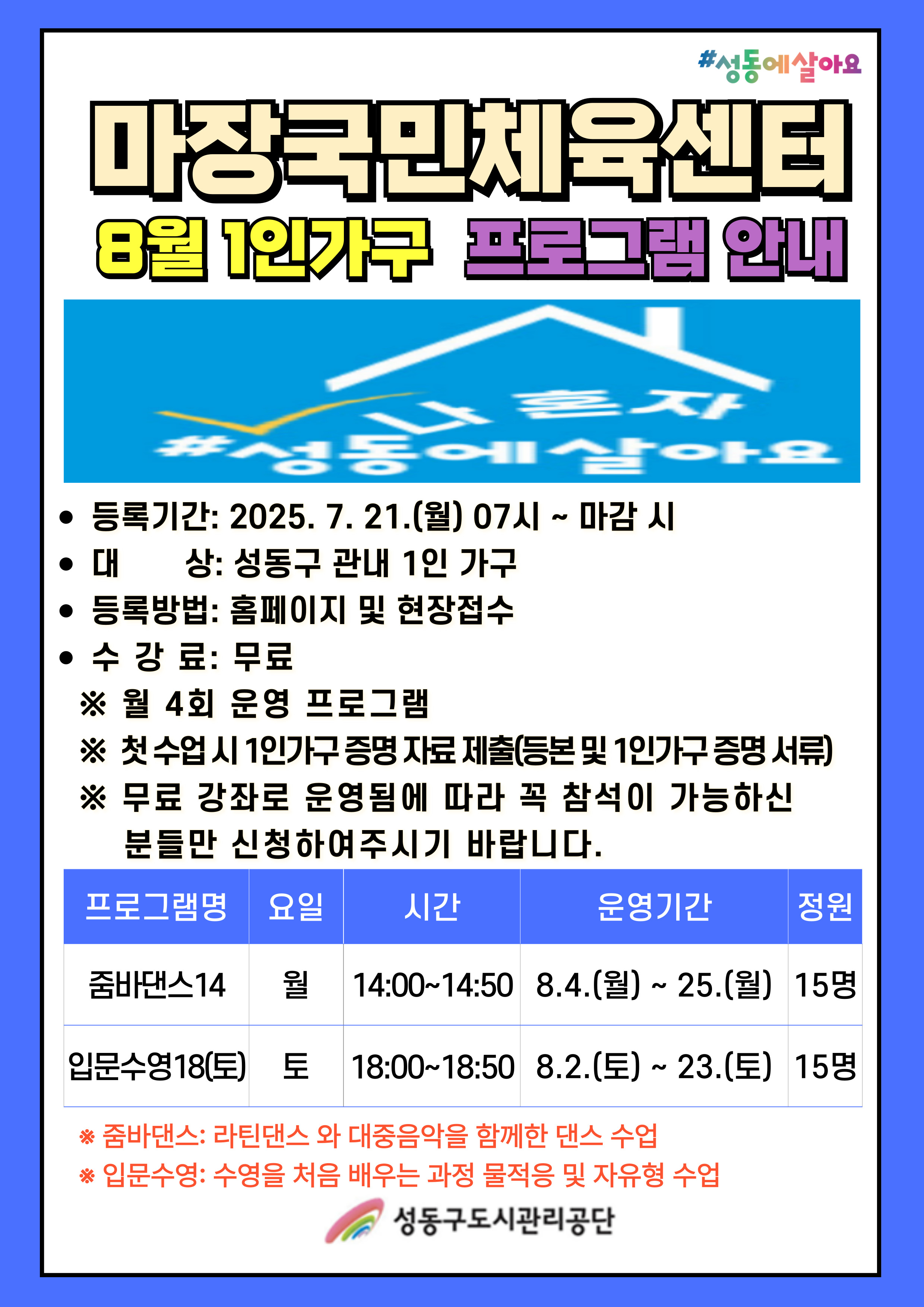 마장국민체육센터 8월 1인가구 프로그램 안내 작성자 관리자 등록일자 2025년 6월 26일 9시 18분 19초 조회 333 8월 1인가구 프로그램 안내문.jpg [ Size : 1.06MB , Down : 233 ] 미리보기 다운로드 목록보기