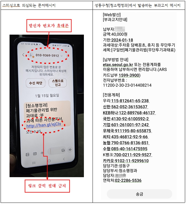 따라서 “[청소행정과]폐기물 관리법 위반 과태료 부과에 따른 사전통지서”라는 문자메시지를 수신할 경우, 절대 링크를 누르지 마시고 112신고 또는 메시지를 삭제하는 등 각별히 주의 부탁드립니다.