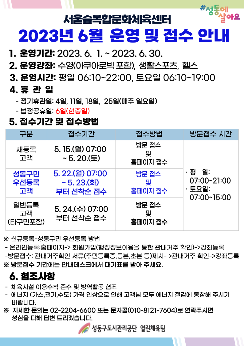 [서울숲복합문화체육센터] 2023년 6월 강좌 운영 및 접수 안내 작성자 관리자 등록일자 2023년 5월 12일 16시 14분 47초 조회 1,245 서울숲복합문화체육센터 6월 운영 및 접수 안내문.png [ Size : 277.68KB , Down : 1,128 ] 미리보기 다운로드 목록보기