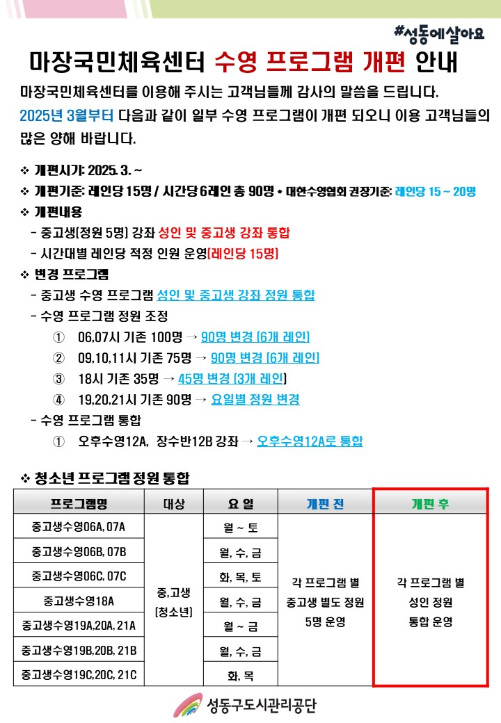 2025년 마장국민체육센터 수영 프로그램 개편 안내 작성자 관리자 등록일자 2025년 1월 31일 11시 50분 34초 조회 1,170 슬라이드1.JPG [ Size : 173.25KB , Down : 1,277 ] 미리보기 다운로드 슬라이드2.JPG [ Size : 151.49KB , Down : 1,273 ] 미리보기 다운로드 목록보기
