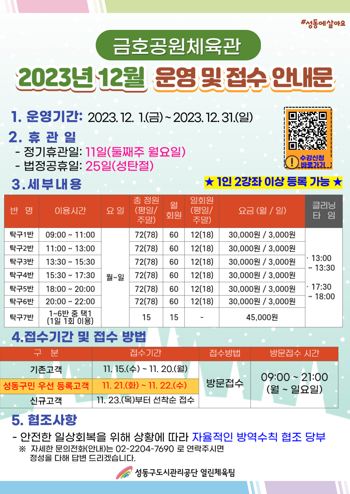 [금호공원] 2023년 12월 운영 및 접수 안내문 작성자 관리자 등록일자 2023년 11월 14일 17시 2분 20초 조회 503 12월 금호공원.png [ Size : 572.03KB , Down : 239 ] 미리보기 다운로드 목록보기