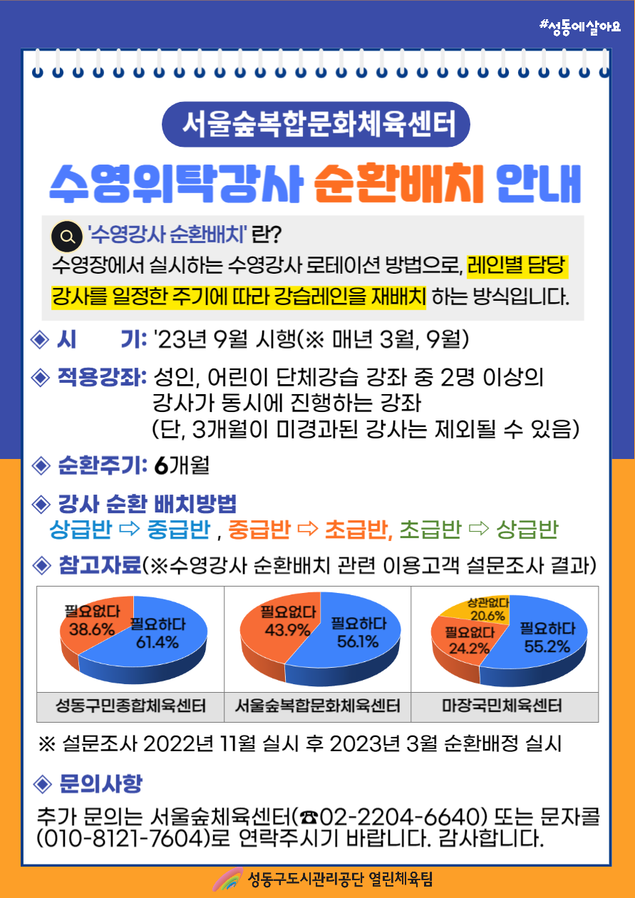 서울숲복합문화체육센터 수영위탁강사 순환배치 안내 작성자 관리자 등록일자 2023년 8월 17일 17시 59분 30초 조회 1,300 사본 -수영강사 순환배치 안내문(서울숲).png [ Size : 331.89KB , Down : 1,392 ] 미리보기 다운로드 목록보기
