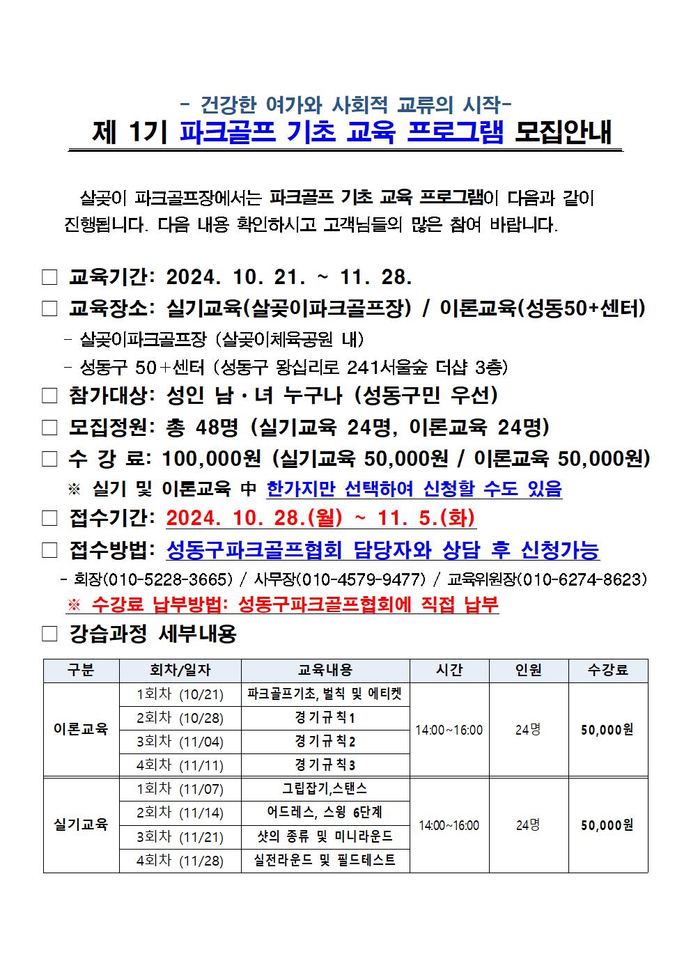 [살곶이파크골프장]제 1기 파크골프 기초교육 프로그램 모집안내 작성자 관리자 등록일자 2024년 10월 28일 15시 24분 21초 조회 825 살곶이 파크골프장에서는 파크골프 기초교육 프로그램이 다음과 같이 진행됩니다.다음 내용 확인하시고 고객님들의 많은 참여 바랍니다. 살곶이파크골프 기초 교육프로그램 공지사항(최종)001.jpg [ Size : 213.92KB , Down : 857 ] 미리보기 다운로드 목록보기