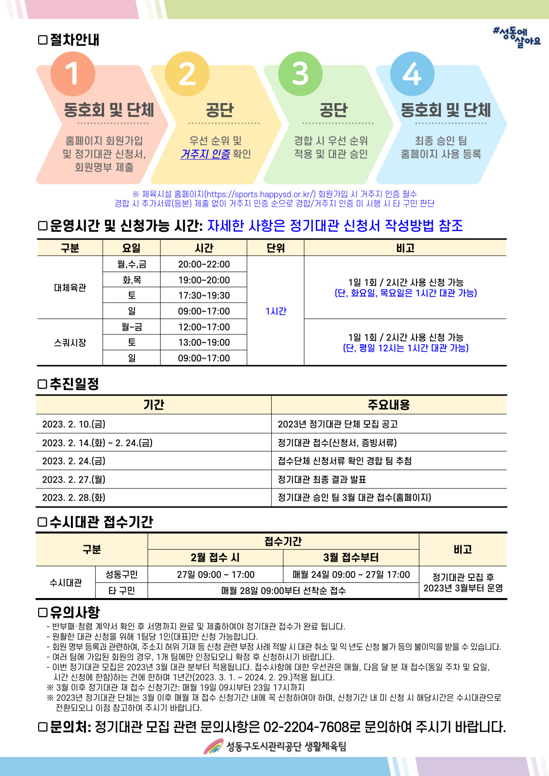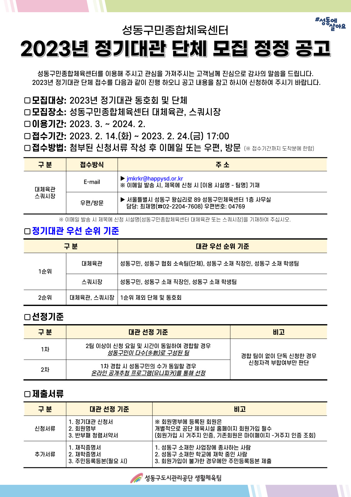 2023년 성동구민종합체육센터 정기대관 모집안내 작성자 관리자 등록일자 2023년 2월 11일 9시 30분 34초 조회 1,759 성동구민종합체육센터 정기대관신청서 및 회원명부(대체육관, 스쿼시장)0210 (2).hwp [ Size : 35.5KB , Down : 566 ] 다운로드 001.jpg [ Size : 349.62KB , Down : 536 ] 미리보기 다운로드 002.jpg [ Size : 403.92KB , Down : 488 ] 미리보기 다운로드 목록보기