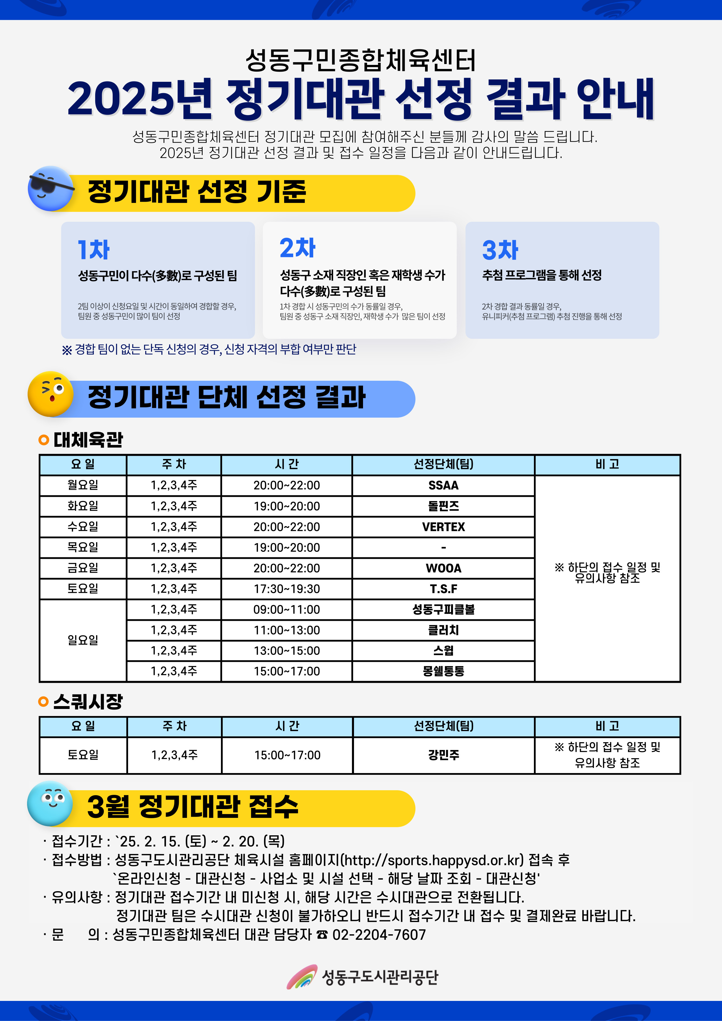 2025년 실내체육시설 정기대관 선정결과(성동, 서울숲) 작성자 관리자 등록일자 2025년 2월 10일 10시 39분 28초 조회 574 확인하시고, 기간내에 신청하시기 바랍니다. 2025 실내체육시설 정기대관 선정결과 (성동).jpg [ Size : 1.01MB , Down : 545 ] 미리보기 다운로드 2025 실내체육시설 정기대관 선정결과 (서울숲).jpg [ Size : 1.11MB , Down : 496 ] 미리보기 다운로드 목록보기