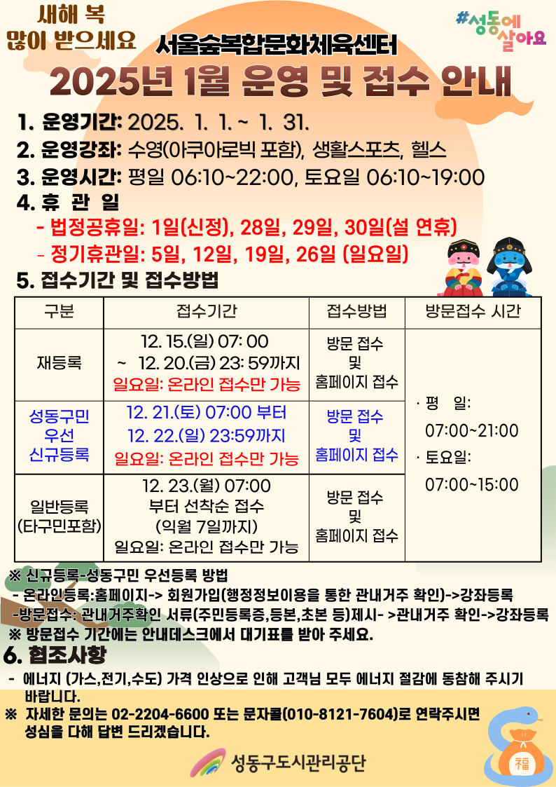 서울숲복합문화체육센터 1월 운영 및 접수 안내