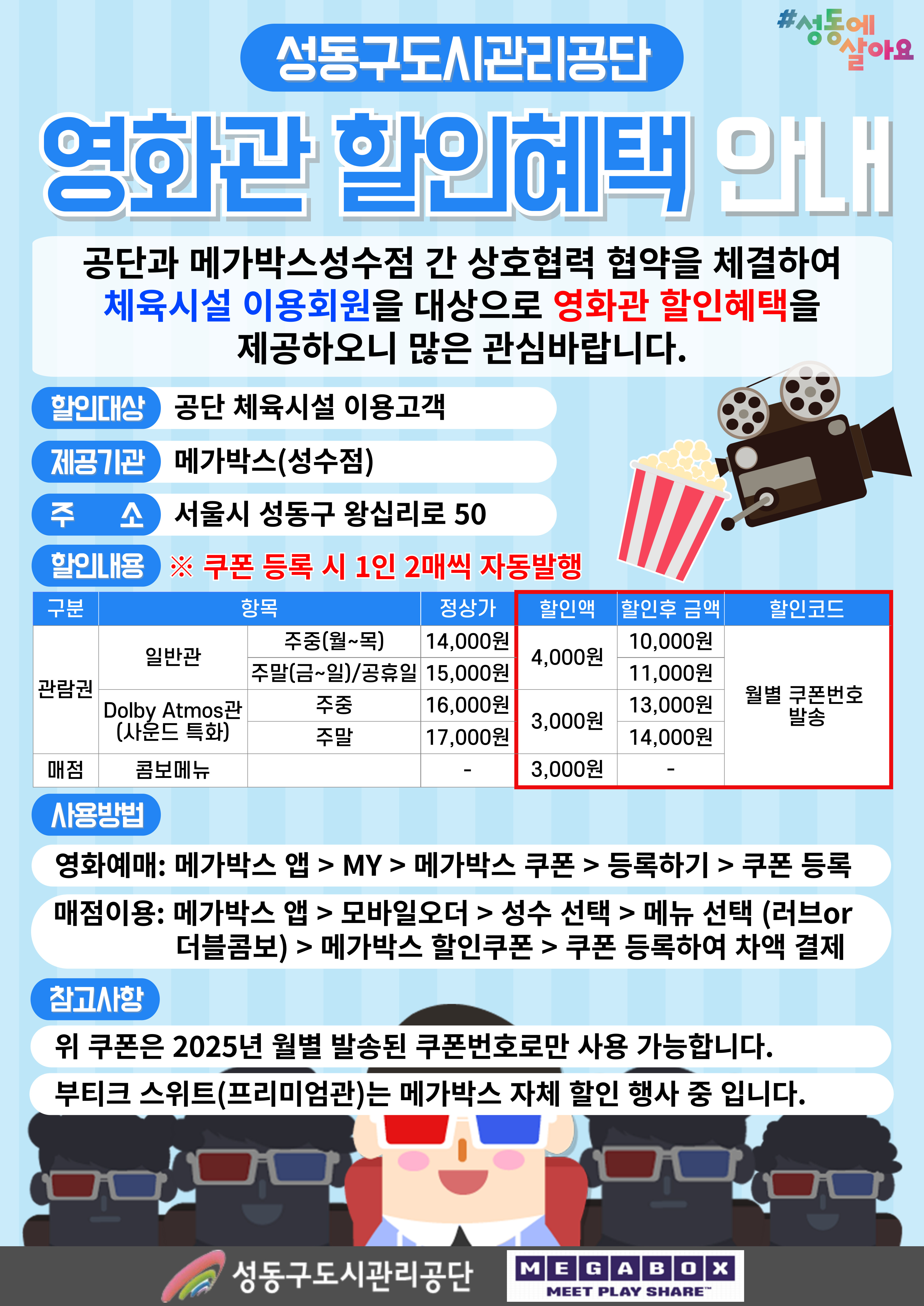 2025년 체육시설 이용 고객 영화관 할인 혜택 안내 작성자 관리자 등록일자 2025년 1월 2일 11시 54분 45초 조회 8,172 성동구도시관리공단과 메가박스 성수점 간 상호협력 협약을 체결하여 체육시설이용회원을 대상으로 영화관 할인혜택을 제공하오니 많은 관심바랍니다.※ 메가박스 성수점이 영업을 종료함에 따라 영화관 할인쿠폰은 10. 12. (일) 까지만 이용 가능함을 알려드립니다. _열린금호_-영화관-할인혜택-안내2025-001.jpg [ Size : 1.9MB , Down : 966 ] 미리보기 다운로드 목록보기