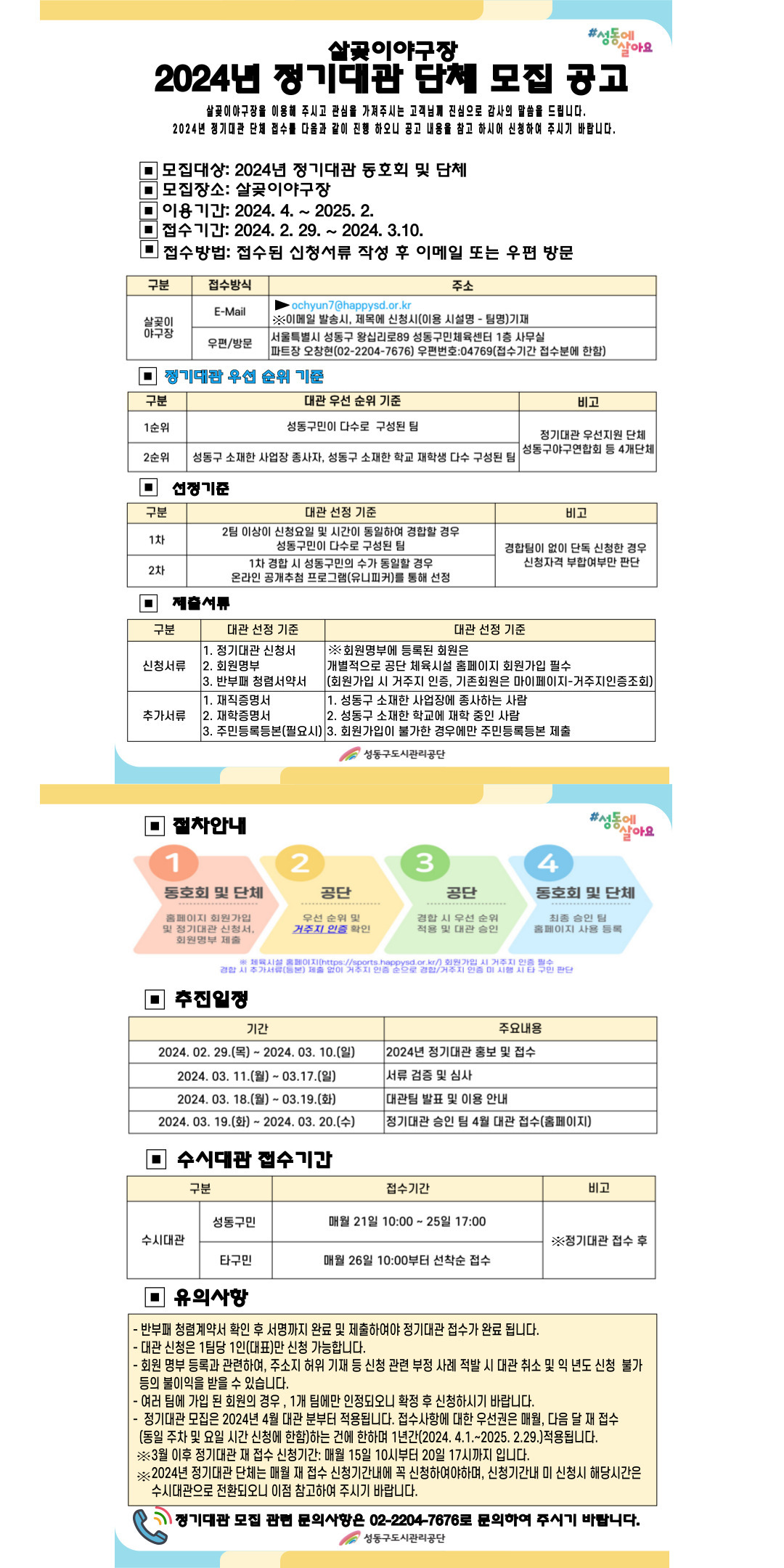 살곶이야구장 2024년 정기대관 단체 모집 공고 작성자 관리자 등록일자 2024년 3월 1일 11시 50분 13초 조회 1,038 2024년 살곶이야구장 정기대관신청서 및 회원명부0228(최종).hwp [ Size : 28.5KB , Down : 436 ] 다운로드 2024년 살곶이야구장 정기배정 모집 계획.jpg [ Size : 480.42KB , Down : 804 ] 미리보기 다운로드 목록보기