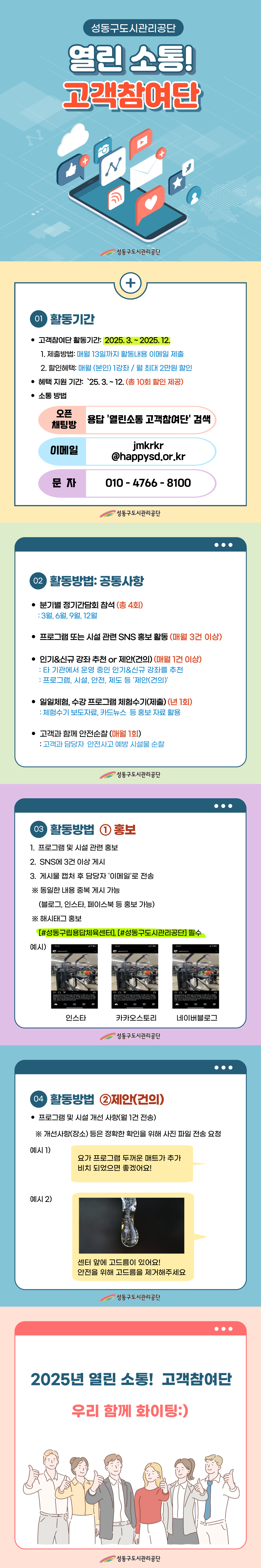 2025년 열린 소통! 고객참여단 모집 안내 작성자 관리자 등록일자 2025년 3월 11일 17시 18분 29초 조회 1,018 2025년 고객참여단(20250311).jpg [ Size : 1.3MB , Down : 1,347 ] 미리보기 다운로드 [붙임1]열린 소통! 고객참여단 가이드라인.png [ Size : 1.33MB , Down : 321 ] 미리보기 다운로드 [붙임2]열린 소통! 고객참여단 지원서(2025.03.11.).hwp [ Size : 24.5KB , Down : 554 ] 다운로드 목록보기