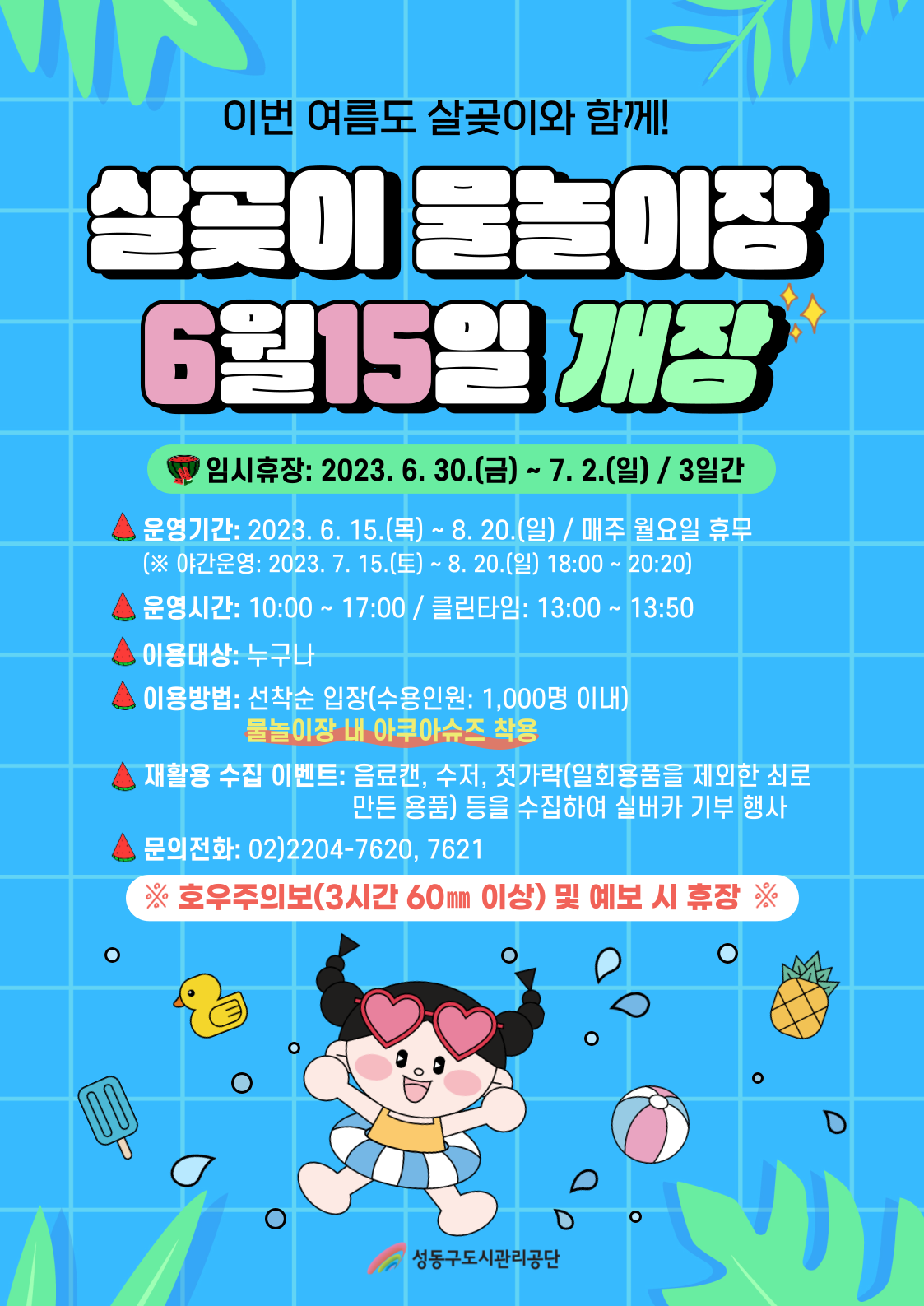 [살곶이 물놀이장] 2023년도 여름 운영 안내 작성자 관리자 등록일자 2023년 6월 12일 11시 27분 0초 조회 1,906 살곶이-물놀이장-001.png [ Size : 443.45KB , Down : 249 ] 미리보기 다운로드 목록보기
