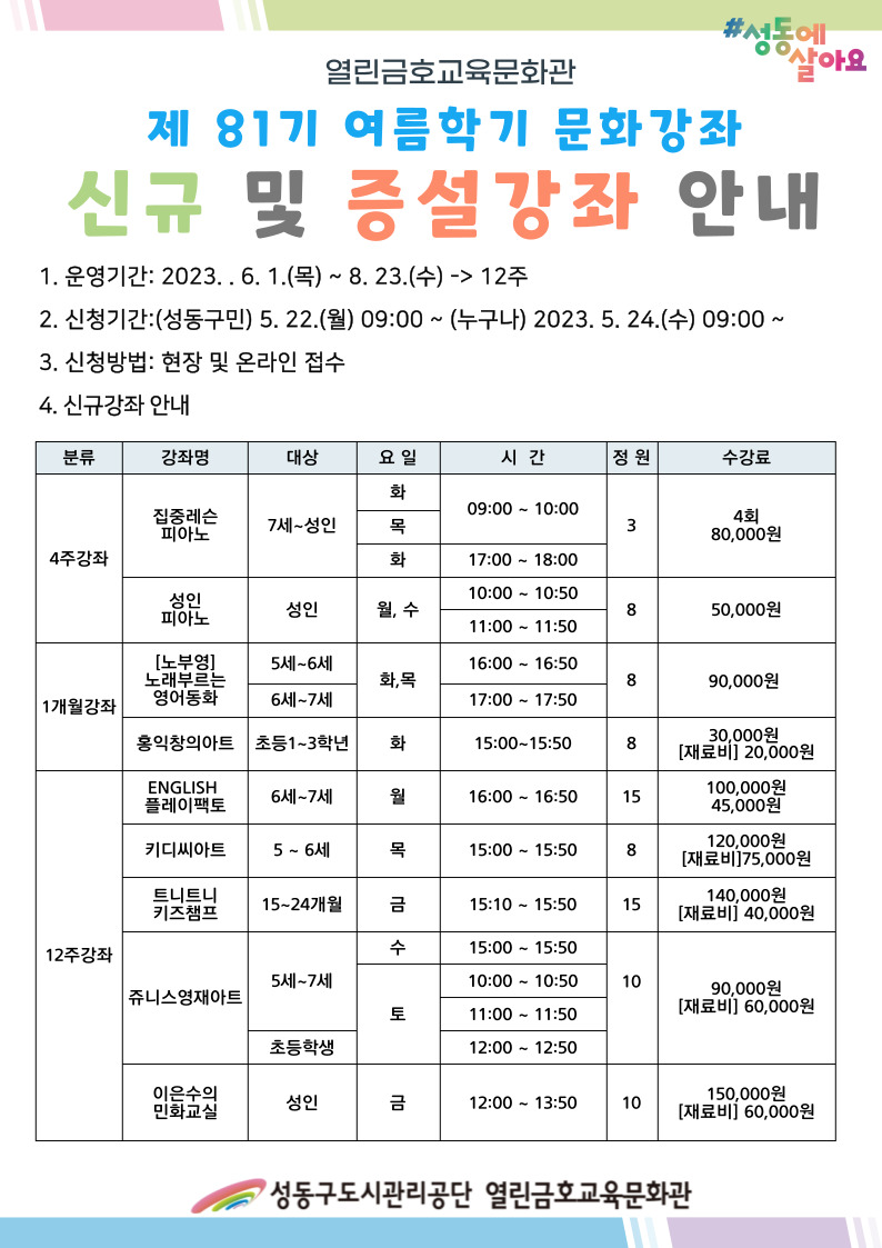 열린금호교육문화관 [열린금호교육문화관] 여름학기 신규 및 증설강좌 안내 작성자 관리자 등록일자 2023년 5월 11일 13시 44분 24초 조회 1,047 여름학기 신규 및 증설강좌 안내.jpg [ Size : 192.56KB , Down : 1,104 ] 미리보기 다운로드 목록보기