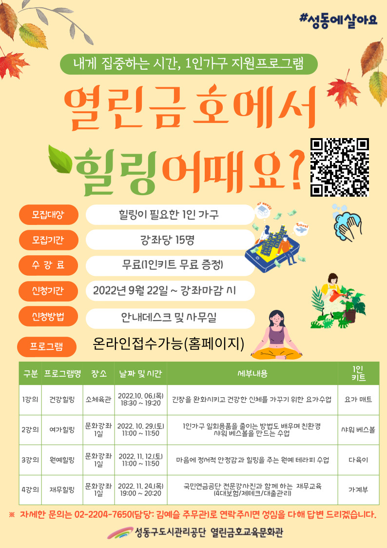열린금호교육문화관 [열린금호교육문화관] 내게 집중하는 시간, 1인가구 지원프로그램 작성자 관리자 등록일자 2022년 9월 27일 15시 14분 30초 조회 735 ▶ 내게 집중하는 시간, 1인가구 지원프로그램 수강신청 바로가기 1인가구 지원프로그램.jpg [ Size : 259.46KB , Down : 764 ] 미리보기 다운로드 목록보기