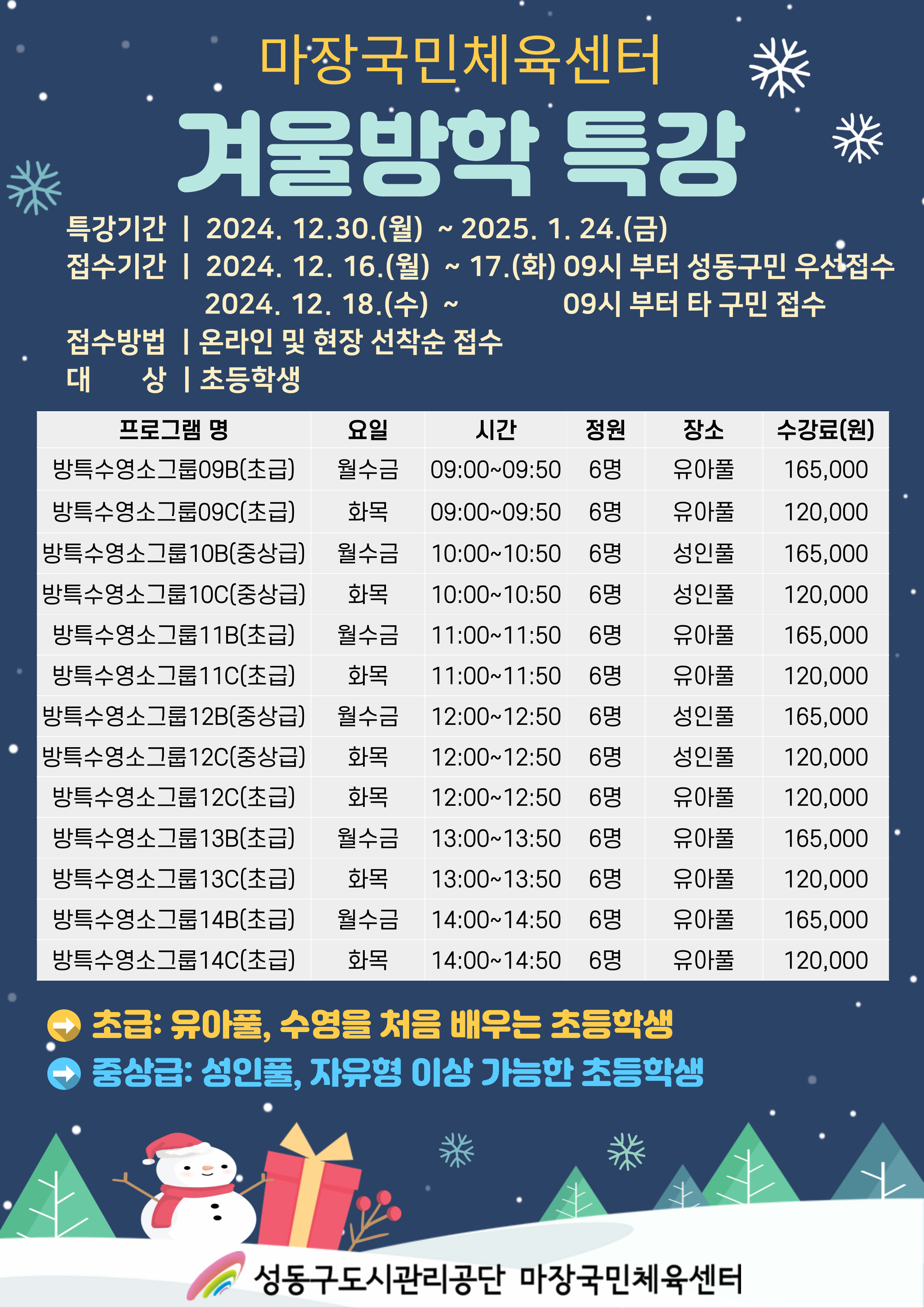 마장국민체육센터 [마장국민체육센터]2024년 겨울방학 특강 프로그램 안내 작성자 관리자 등록일자 2024년 11월 26일 10시 43분 10초 조회 928 2024년 -겨울방학특강 안내문 (1).jpg [ Size : 1.18MB , Down : 1,079 ] 미리보기 다운로드 목록보기