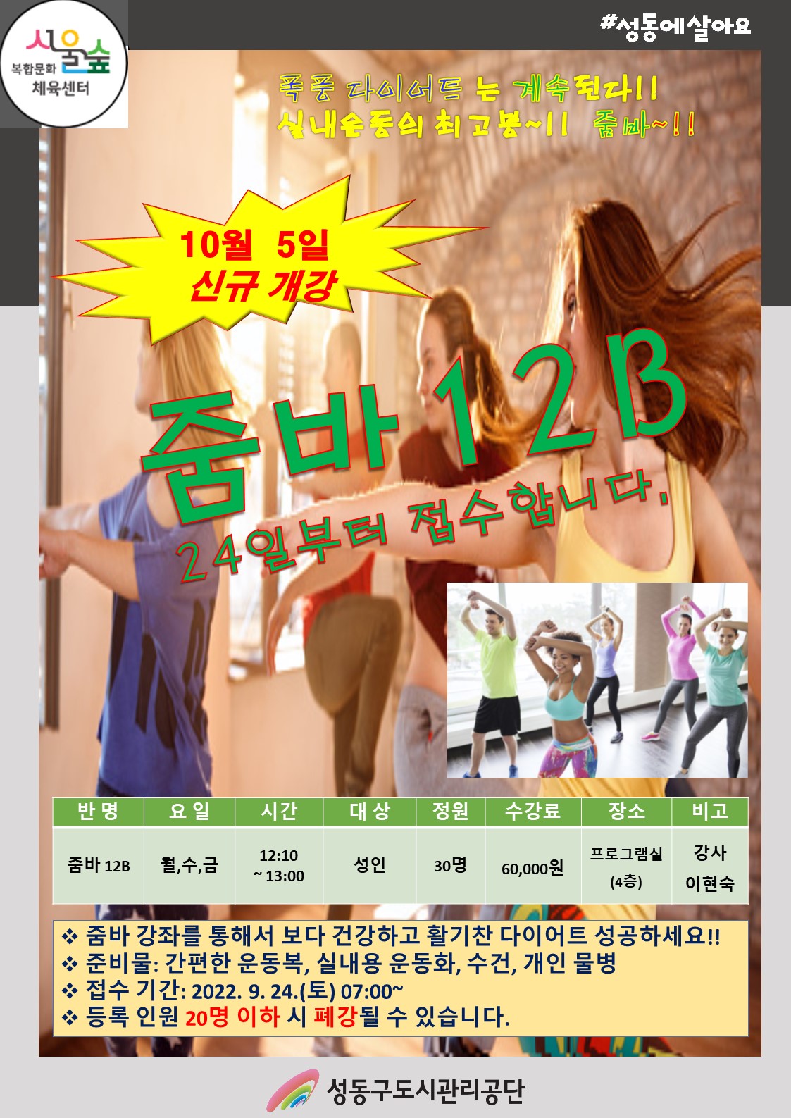 서울숲복합문화체육센터 서울숲복합문화체육센터 10월 신규강좌 줌바댄스 안내 작성자 관리자 등록일자 2022년 9월 15일 16시 42분 31초 조회 1,064 서울숲복합문화체육센터 10월 신규강좌 줌바댄스 안내문.jpg [ Size : 363.27KB , Down : 1,142 ] 미리보기 다운로드 목록보기