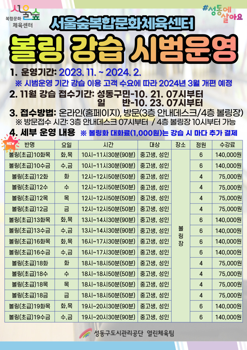 서울숲복합문화체육센터 볼링강습 시범운영 및 무료 공개강좌 안내 작성자 관리자 등록일자 2023년 10월 6일 14시 24분 39초 조회 2,949 붙임2. 볼링 무료 공개강좌 운영 및 모집 홍보 안내문(안).jpg [ Size : 245.72KB , Down : 3,508 ] 미리보기 다운로드 붙임1. 볼링 강습 시범운영 홍보 안내문(안).jpg [ Size : 396.63KB , Down : 3,354 ] 미리보기 다운로드 목록보기