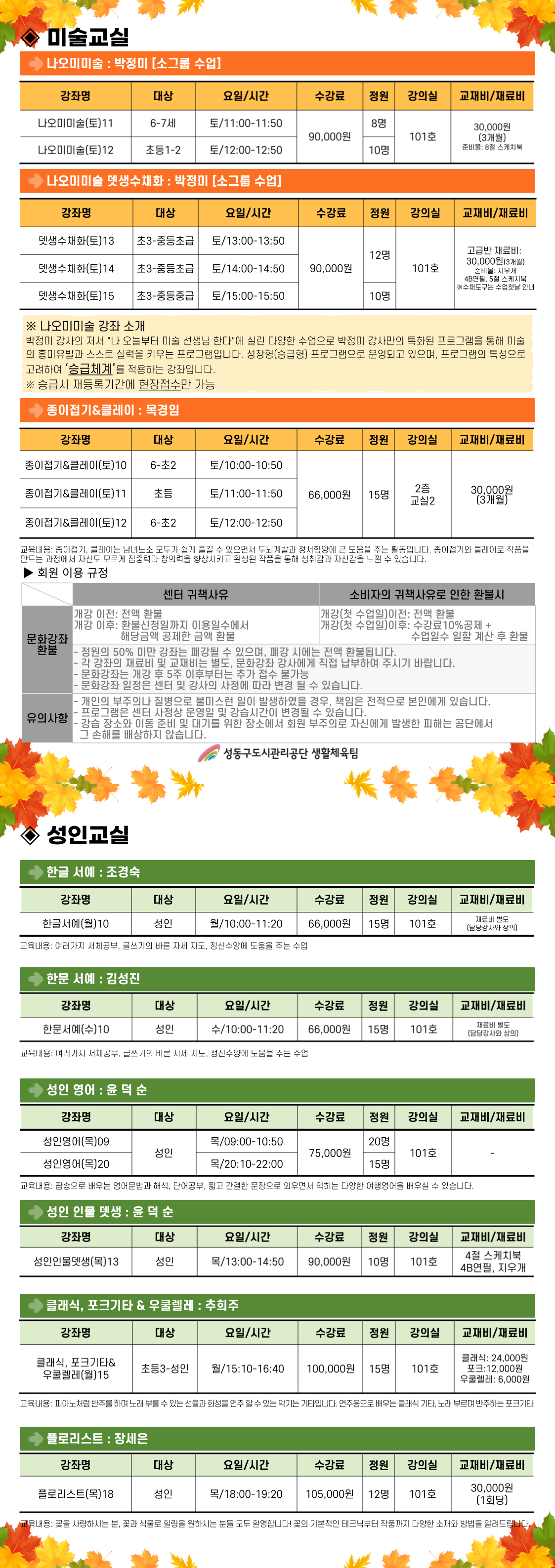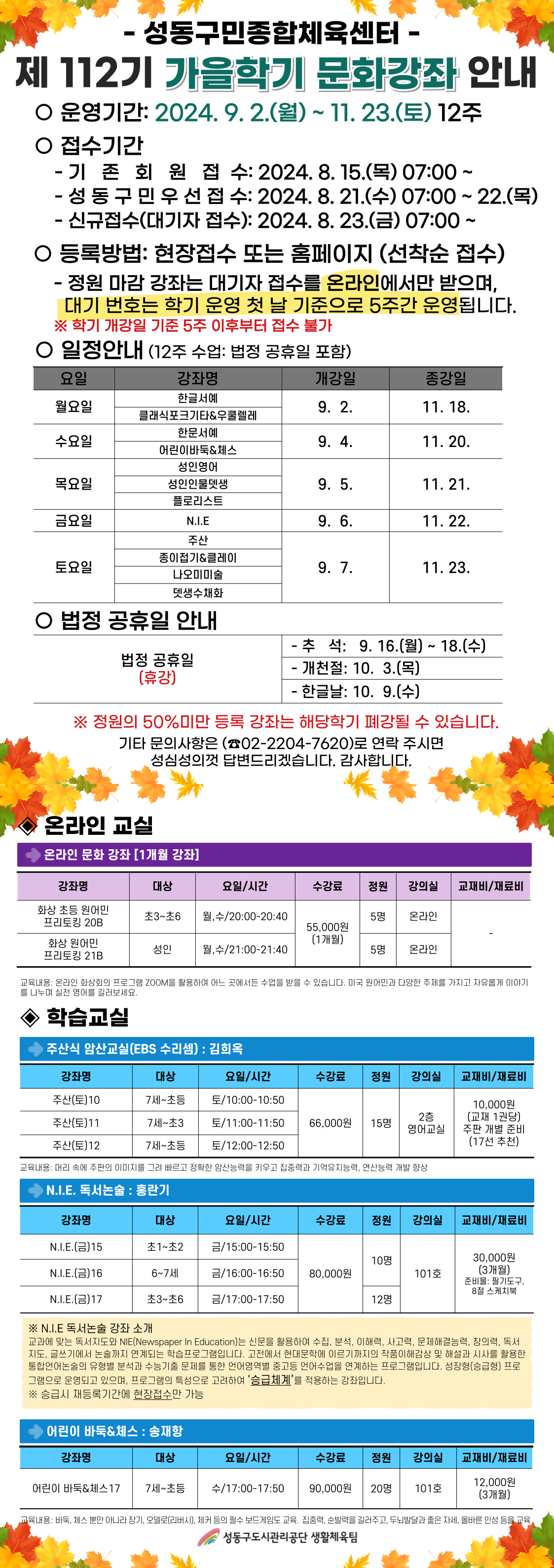 성동구민종합체육센터 [성동구민종합체육센터] 제112기 가을학기 문화강좌 운영 및 접수 안내
