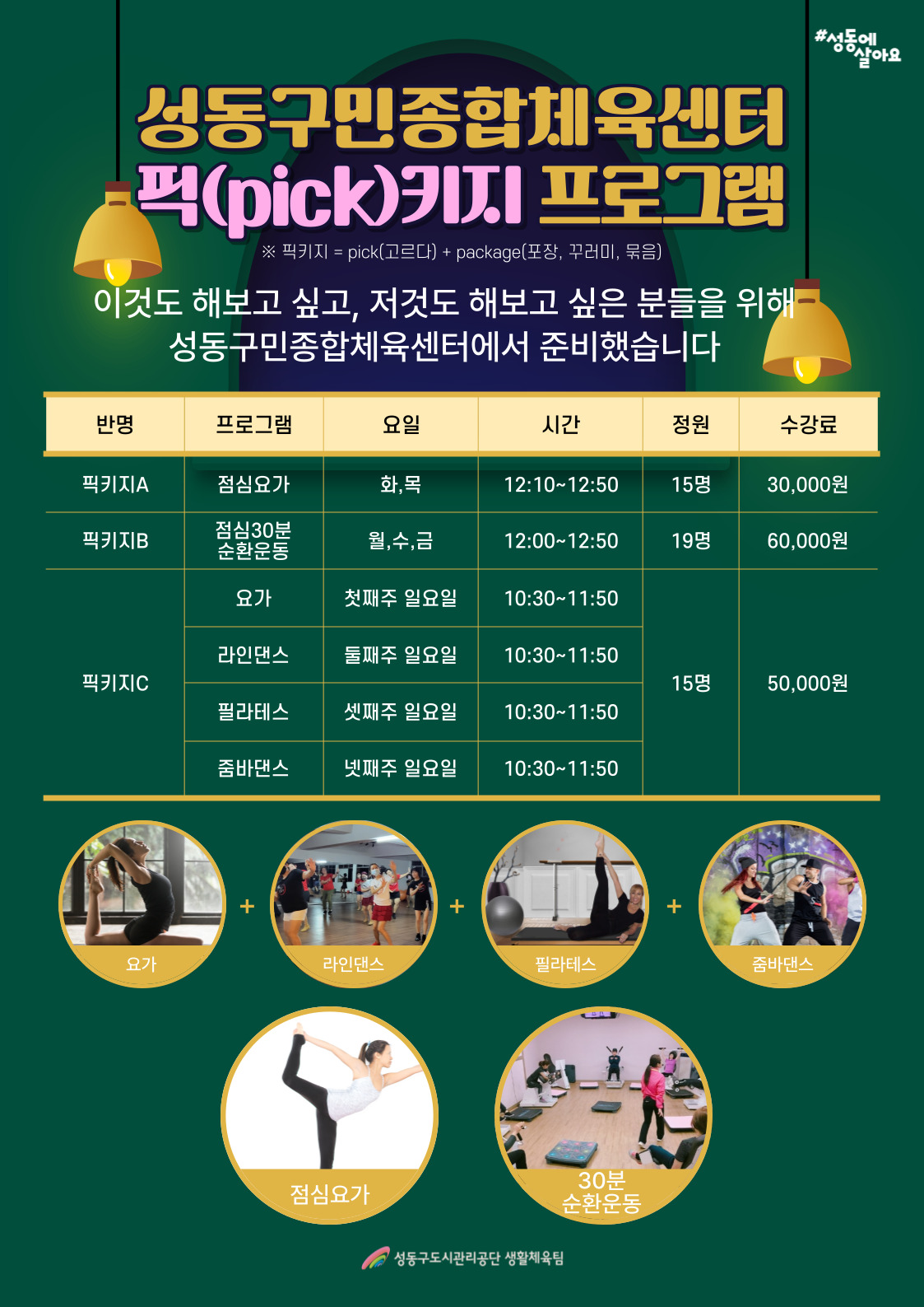 성동구민종합체육센터 [성동구민종합체육센터] 픽(Pick)키지 프로그램 신설 안내 작성자 관리자 등록일자 2023년 3월 24일 9시 36분 7초 조회 2,319 궁금하신 점은 성동구민종합체육센터(02-2204-7600)로 연락주세요 홈페이지_신설프로그램_1.jpg [ Size : 407.15KB , Down : 2,179 ] 미리보기 다운로드 목록보기