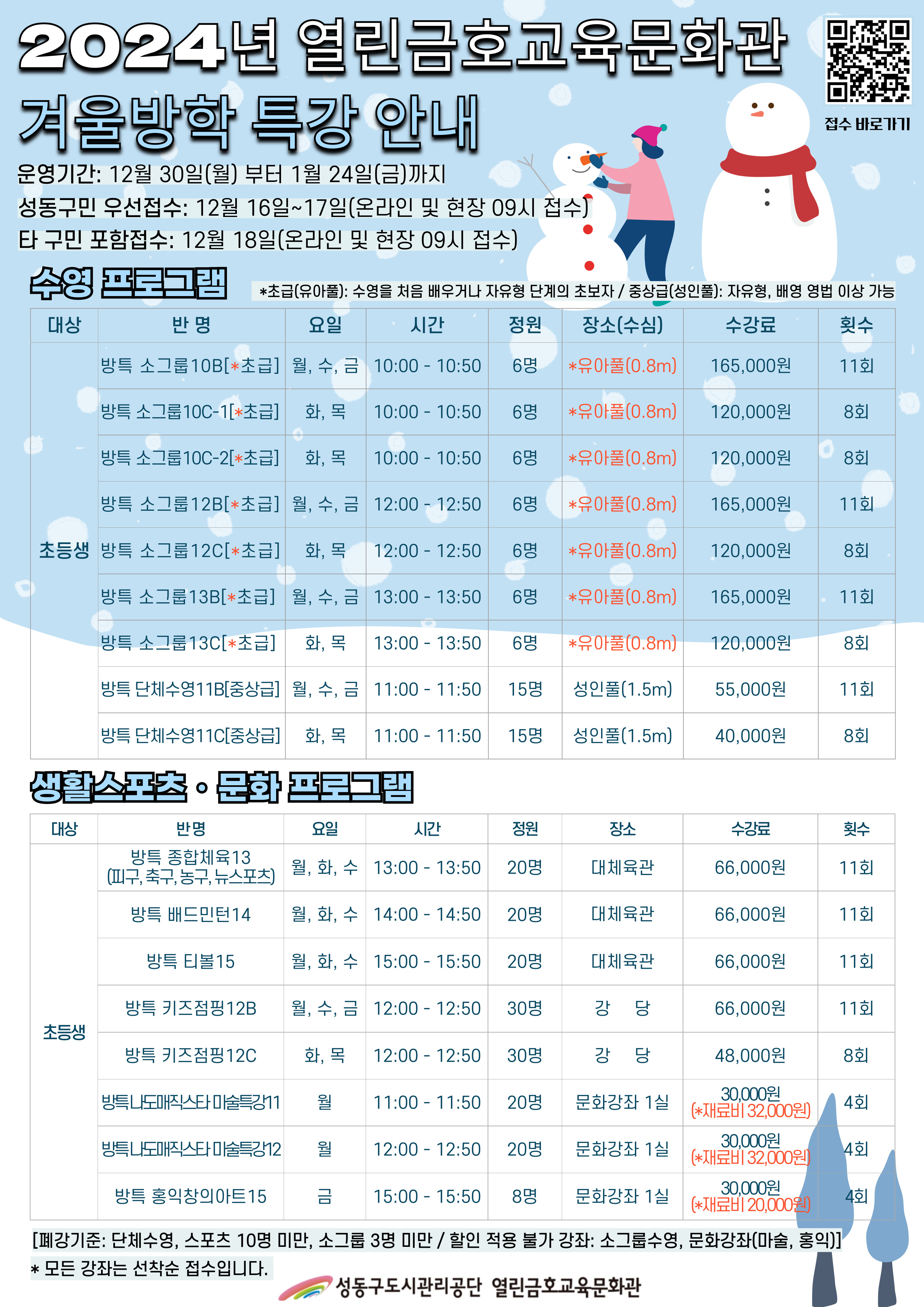 열린금호교육문화관 [열린금호교육문화관] 2024년 겨울방학 특강 프로그램 안내 작성자 관리자 등록일자 2024년 11월 29일 11시 31분 44초 조회 743 ● 접수 바로가기: https://m.site.naver.com/1y5WF 2024년 열린금호 방학특강 안내문.jpg [ Size : 1.77MB , Down : 916 ] 미리보기 다운로드 목록보기