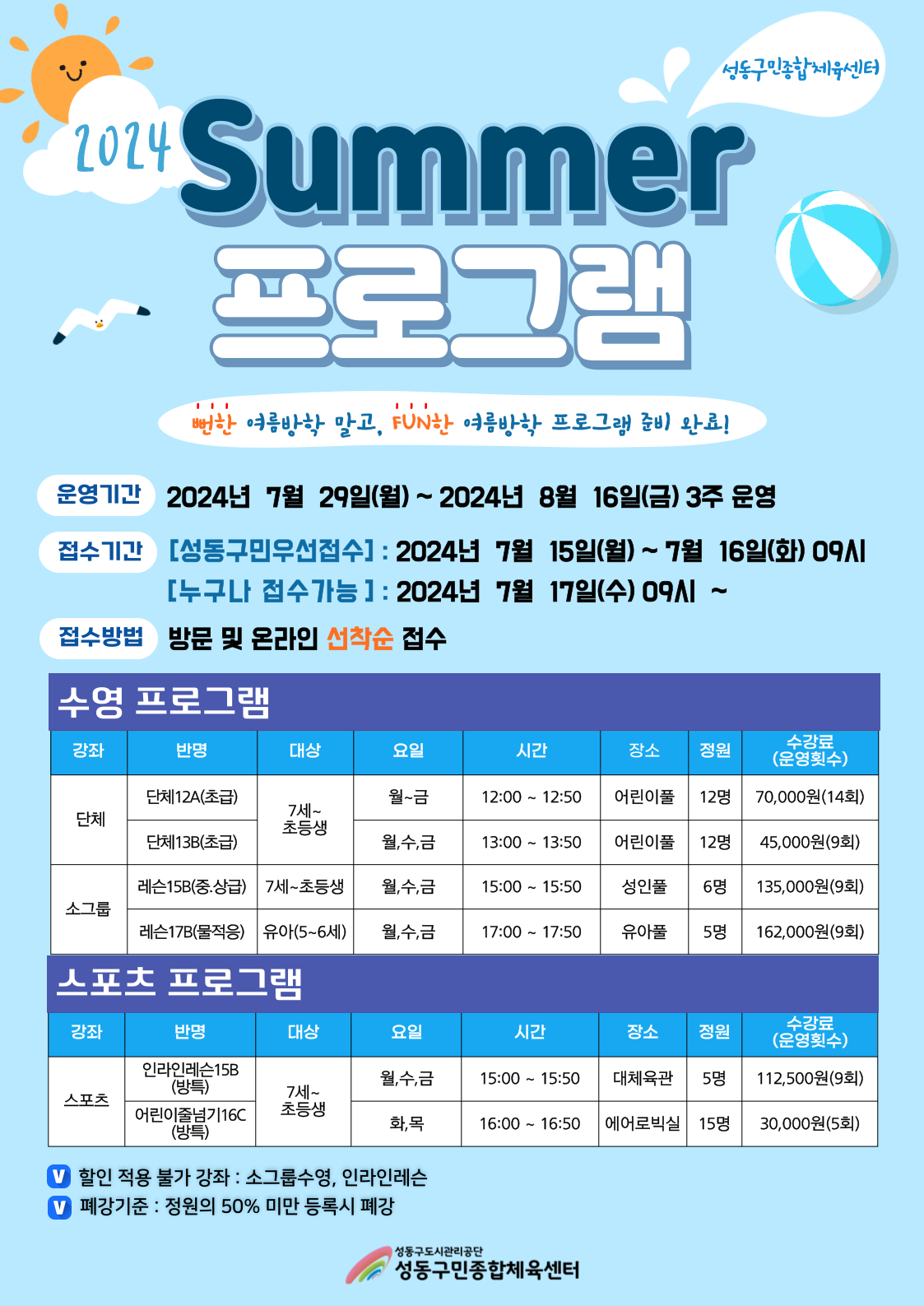 성동구민종합체육센터 [성동구민종합체육센터] 2024 여름방학특강 프로그램 안내 작성자 관리자 등록일자 2024년 7월 3일 10시 14분 35초 조회 1,099 무더운 여름방학 놀면 뭐하니~?성동구민종합체육센터에서는 FUN한 여름방학 프로그램을 다음과 같이 준비했습니다.다음 내용 확인하시고 궁금하신 점 있으시면 02-2204-7600으로 연락주세요~ 2024년-여름방학특강-001.png [ Size : 369.32KB , Down : 1,239 ] 미리보기 다운로드 목록보기