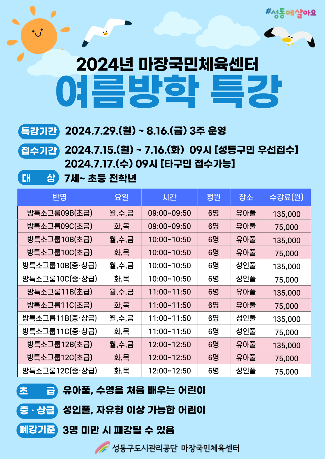 마장국민체육센터 [마장국민체육센터] 2024년 여름방학 특강 프로그램 안내 작성자 관리자 등록일자 2024년 6월 14일 17시 1분 54초 조회 736 여름방학특강-A3-001.png [ Size : 385.01KB , Down : 844 ] 미리보기 다운로드 목록보기
