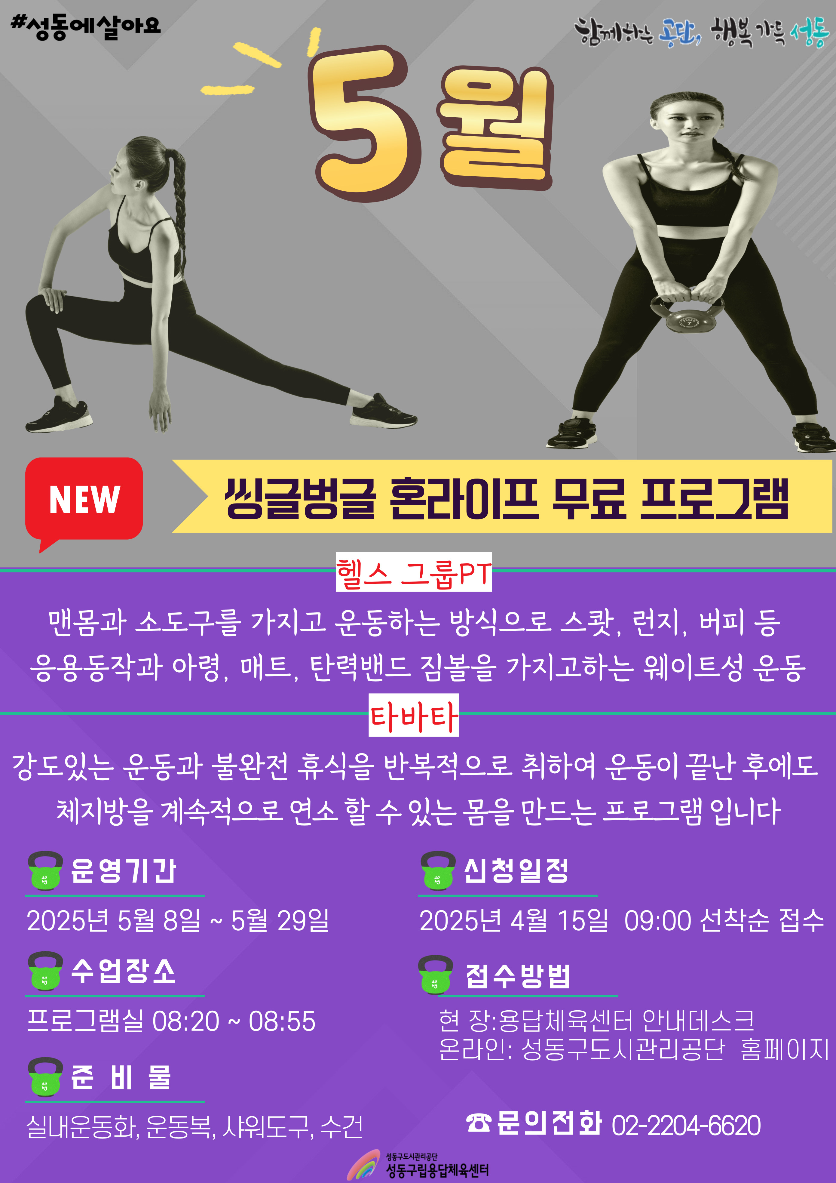 공지 성동구립용답체육센터 [성동구립용답체육센터]5월 1인가구 지원 씽글(single)벙글 혼라이프 안내 작성자 관리자 등록일자 2025년 4월 4일 11시 25분 32초 조회 535 사본 -5월 혼라이프 홍보물(0403).jpg [ Size : 1.25MB , Down : 569 ] 미리보기 다운로드 목록보기