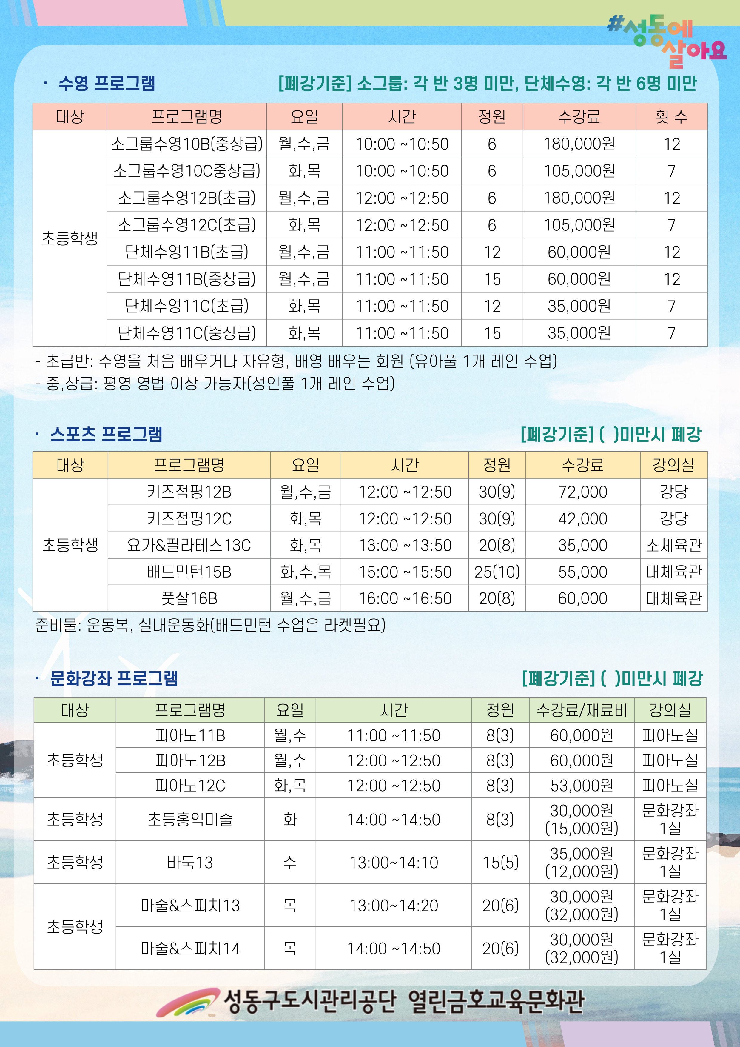 열린금호교육문화관 [열린금호교육문화관] 2023년도 열린금호교육문화관 여름방학특강 작성자 관리자 등록일자 2023년 6월 8일 10시 5분 41초 조회 1,829 여름방학특강-1.jpg [ Size : 1.24MB , Down : 1,200 ] 미리보기 다운로드 여름방학특강-2.jpg [ Size : 1.37MB , Down : 1,137 ] 미리보기 다운로드 목록보기