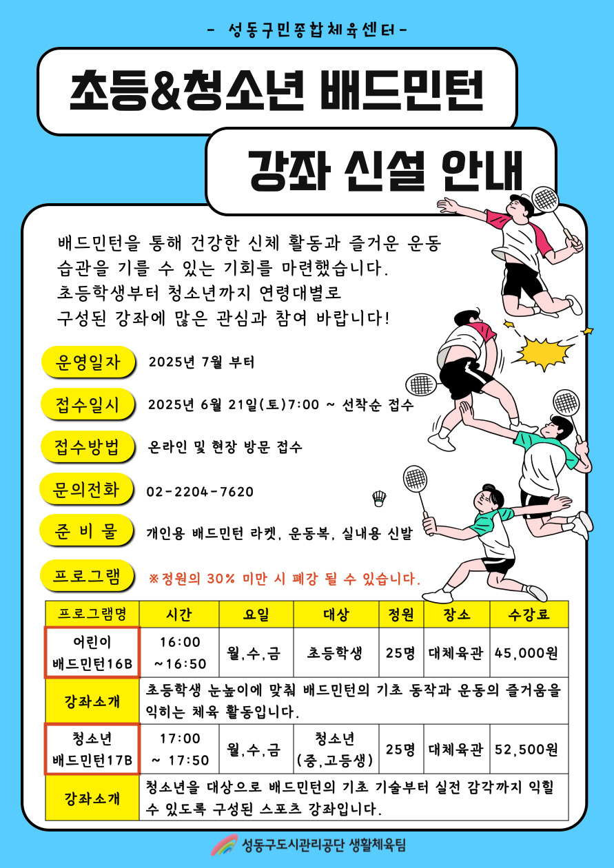 성동구민종합체육센터 [성동구민종합체육센터] 초등&청소년 배드민턴 강좌 신설 안내