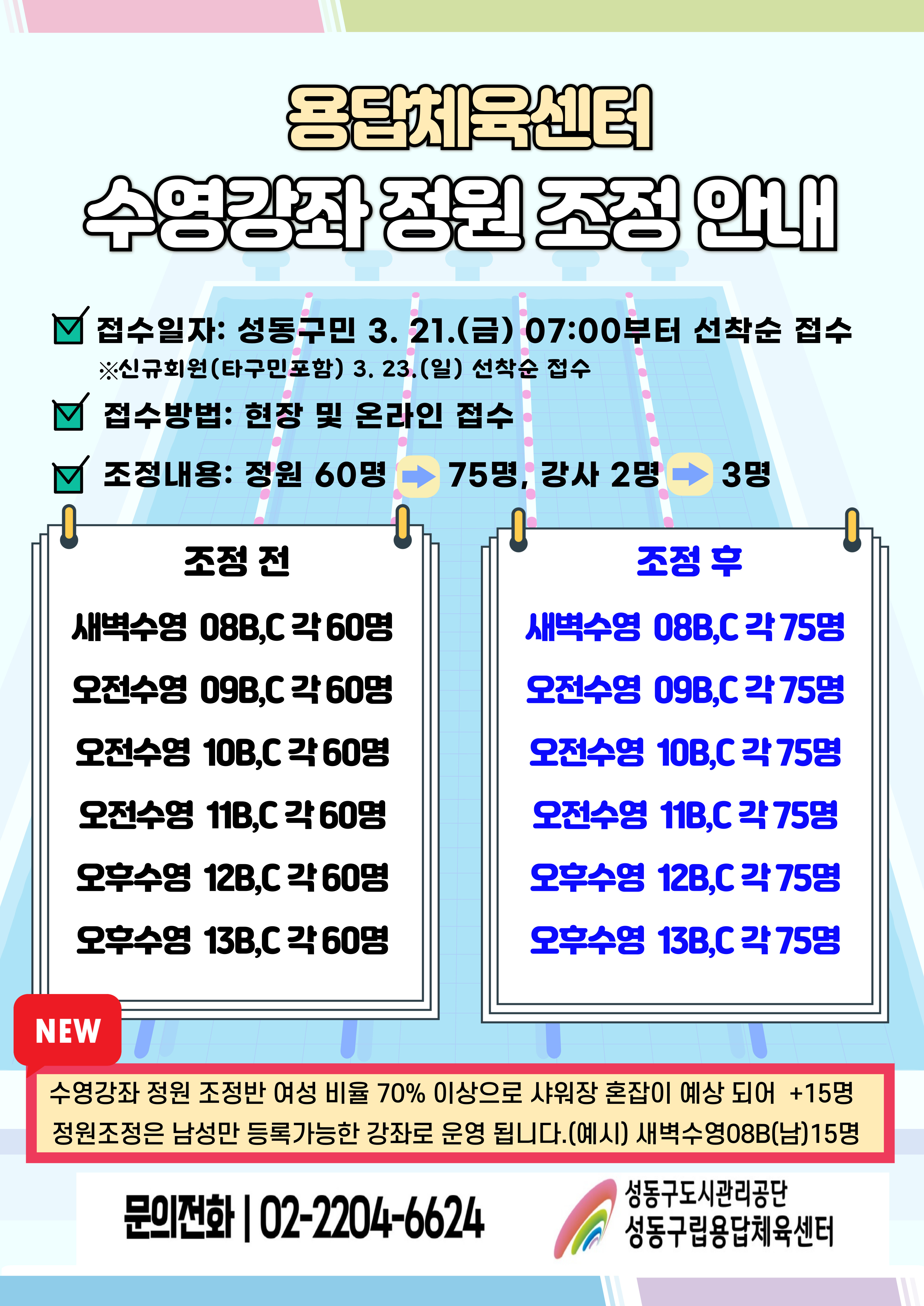 공지 성동구립용답체육센터 [용답체육센터] 수영강좌 정원 조정 안내 작성자 관리자 등록일자 2025년 3월 12일 15시 3분 24초 조회 552 수영강좌 정원 조정 안내문(0312).jpg [ Size : 1.89MB , Down : 624 ] 미리보기 다운로드 목록보기