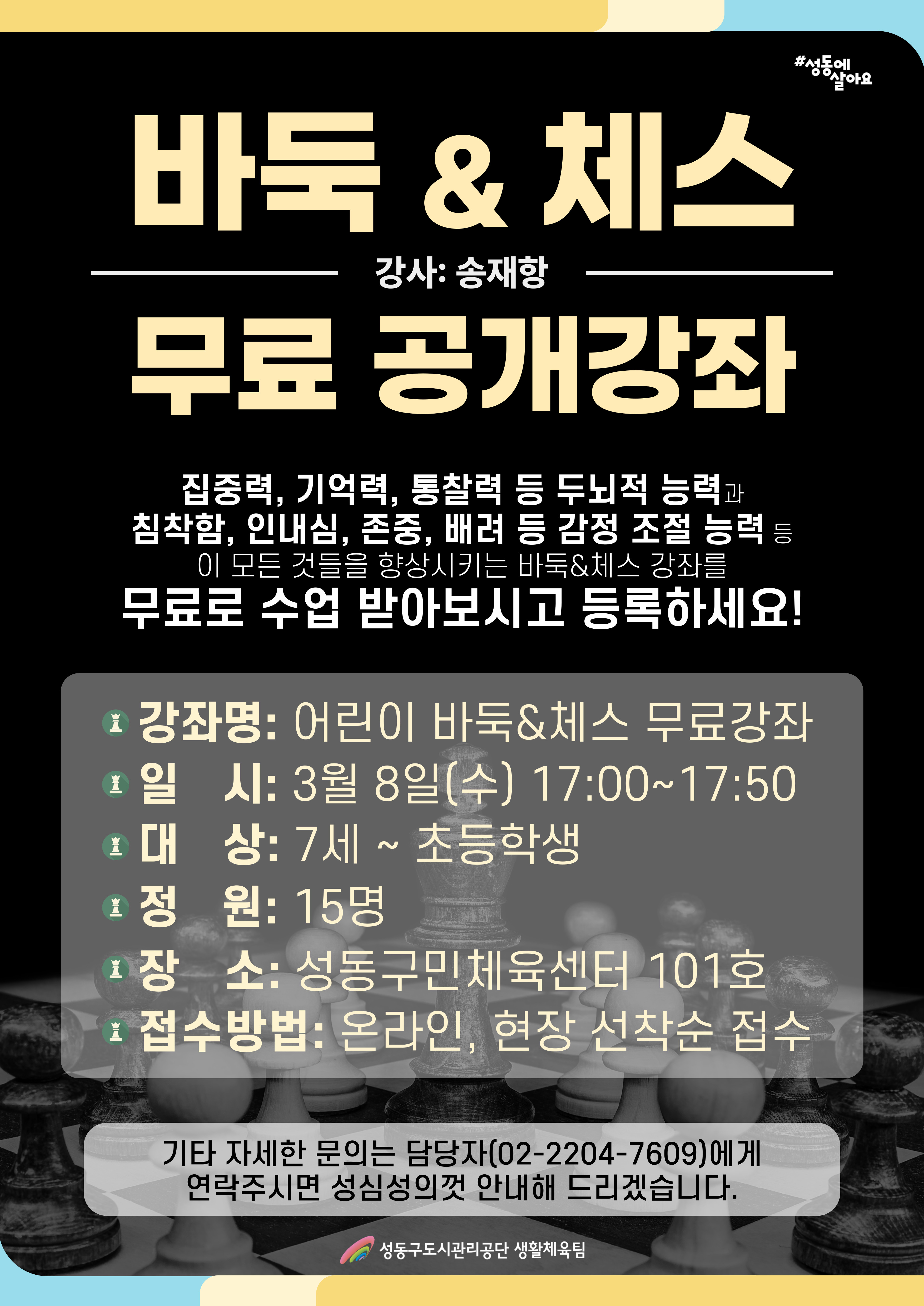 성동구민종합체육센터 [성동구민종합체육센터] 어린이 바둑&체스 무료 공개강좌 안내 작성자 관리자 등록일자 2023년 3월 2일 14시 31분 29초 조회 1,083 바둑_체스-무료.jpg [ Size : 1.43MB , Down : 1,095 ] 미리보기 다운로드 목록보기
