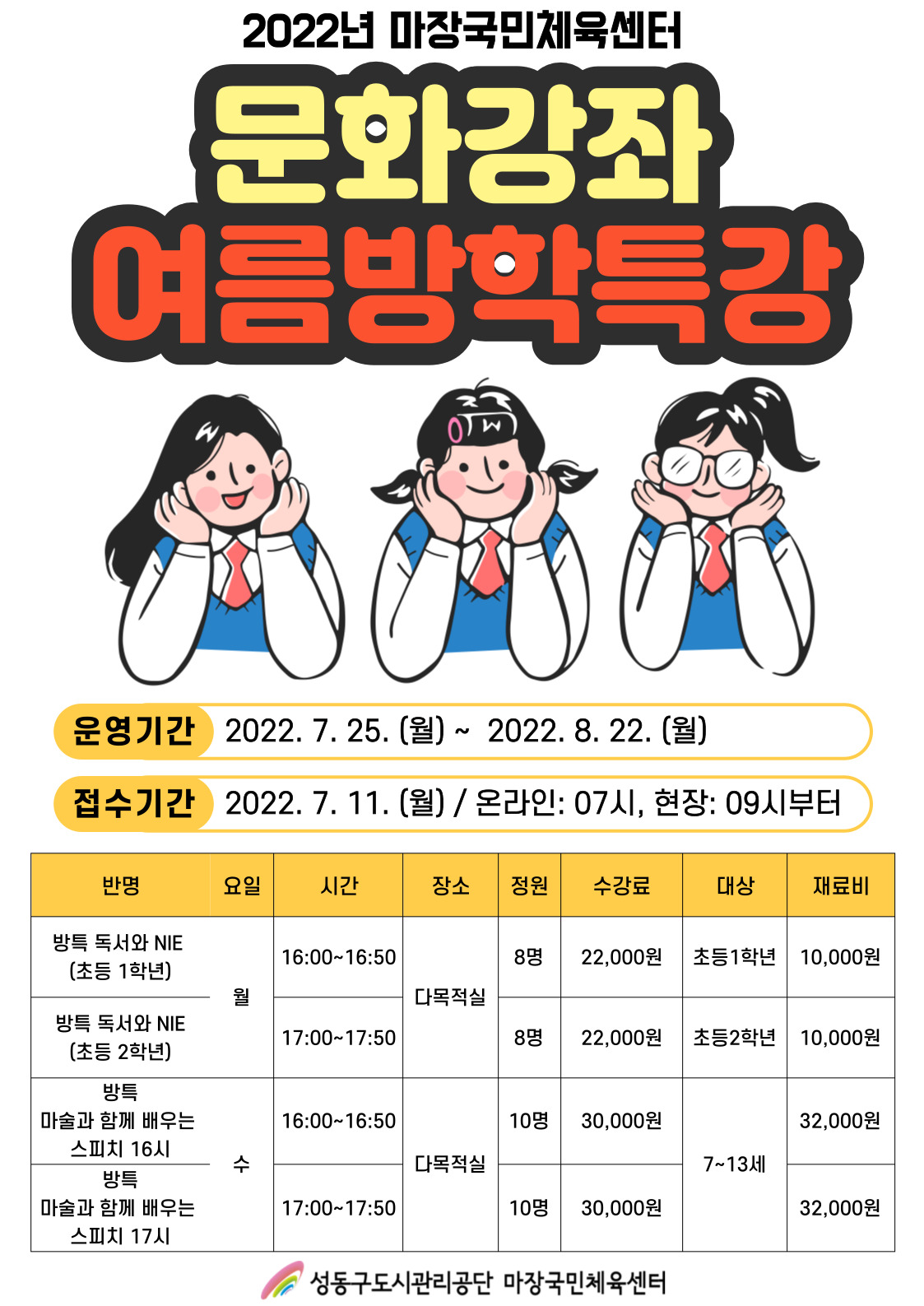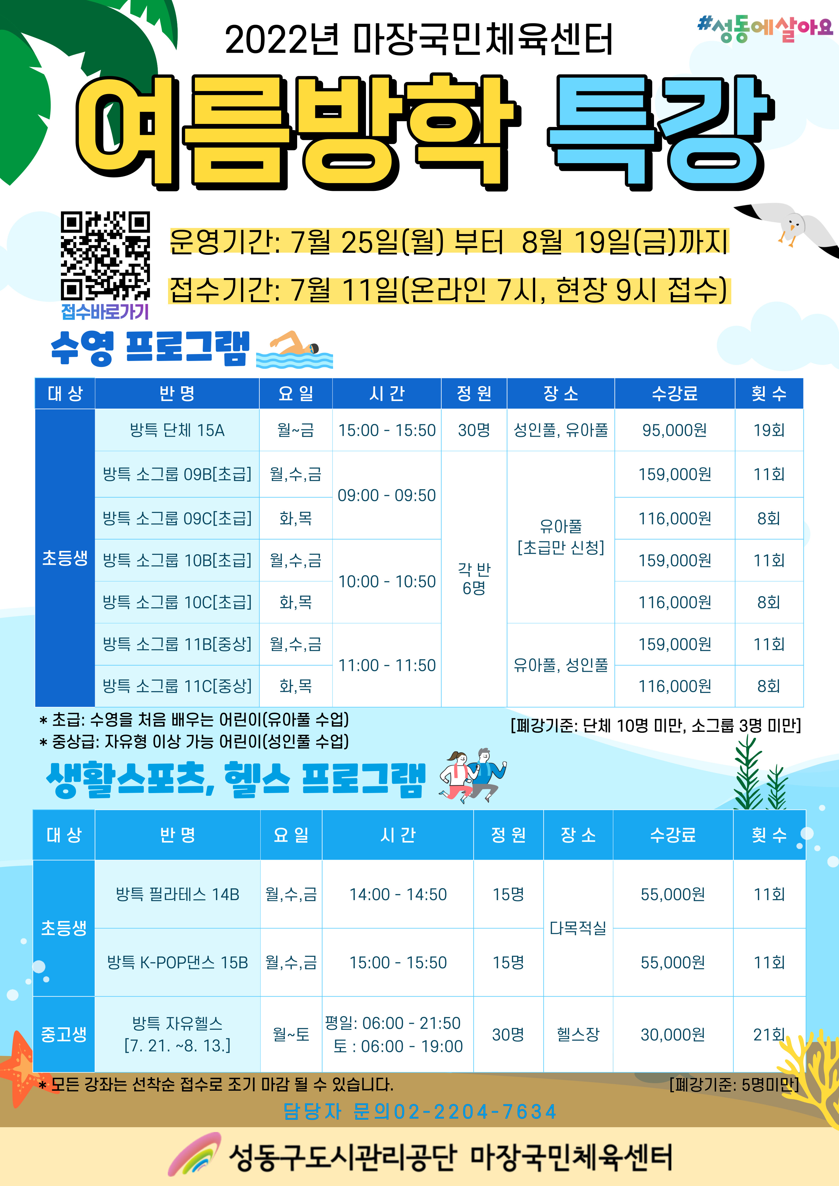 마장국민체육센터 마장국민체육센터 여름방학특강 안내 작성자 관리자 등록일자 2022년 6월 22일 17시 40분 12초 조회 1,513 최종-여름방학특강-001 (2)_최종!!.jpg [ Size : 1.51MB , Down : 1,574 ] 미리보기 다운로드 문화강좌-여름방학특강-안내문-001 (2).jpg [ Size : 331.56KB , Down : 1,381 ] 미리보기 다운로드 목록보기