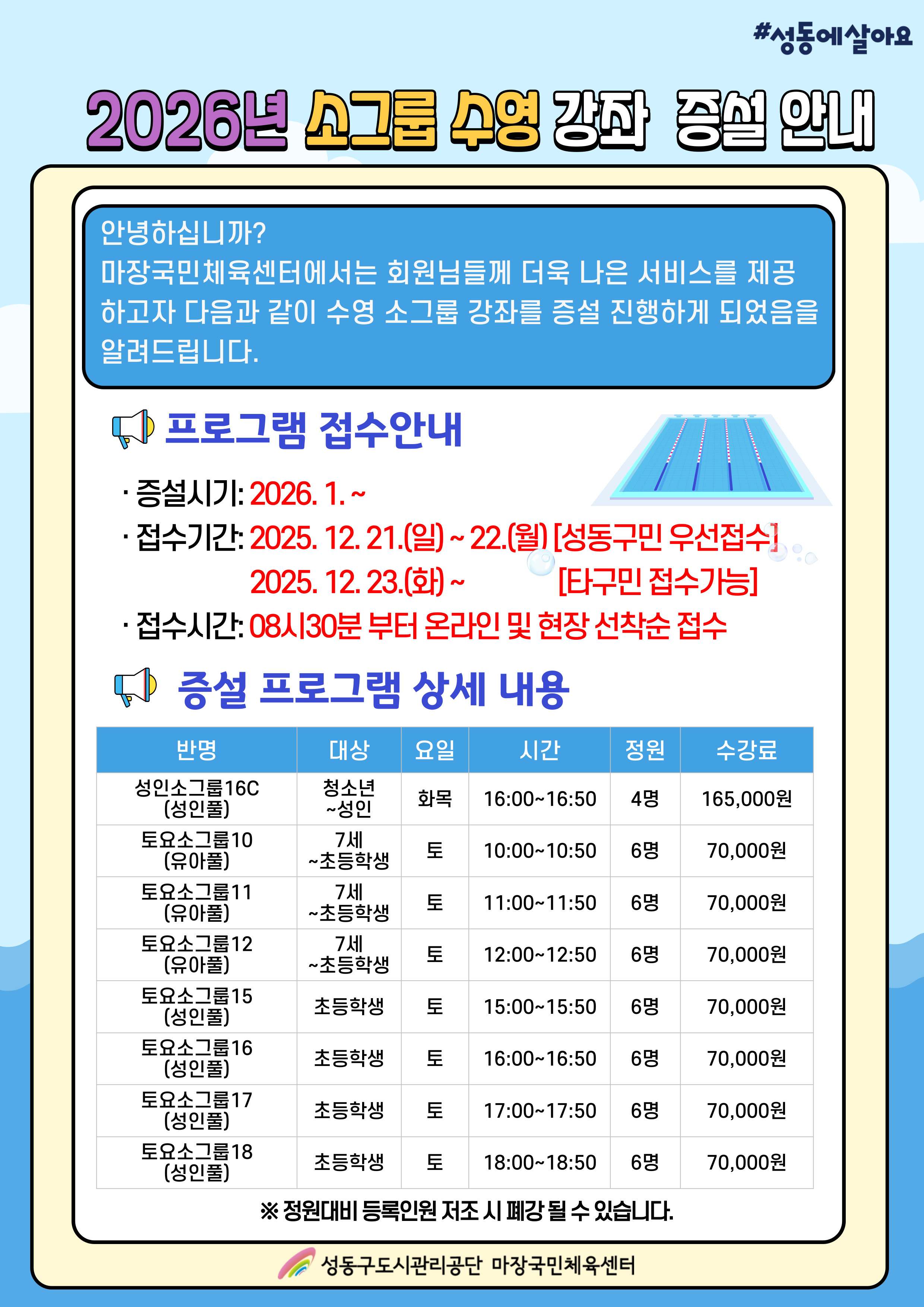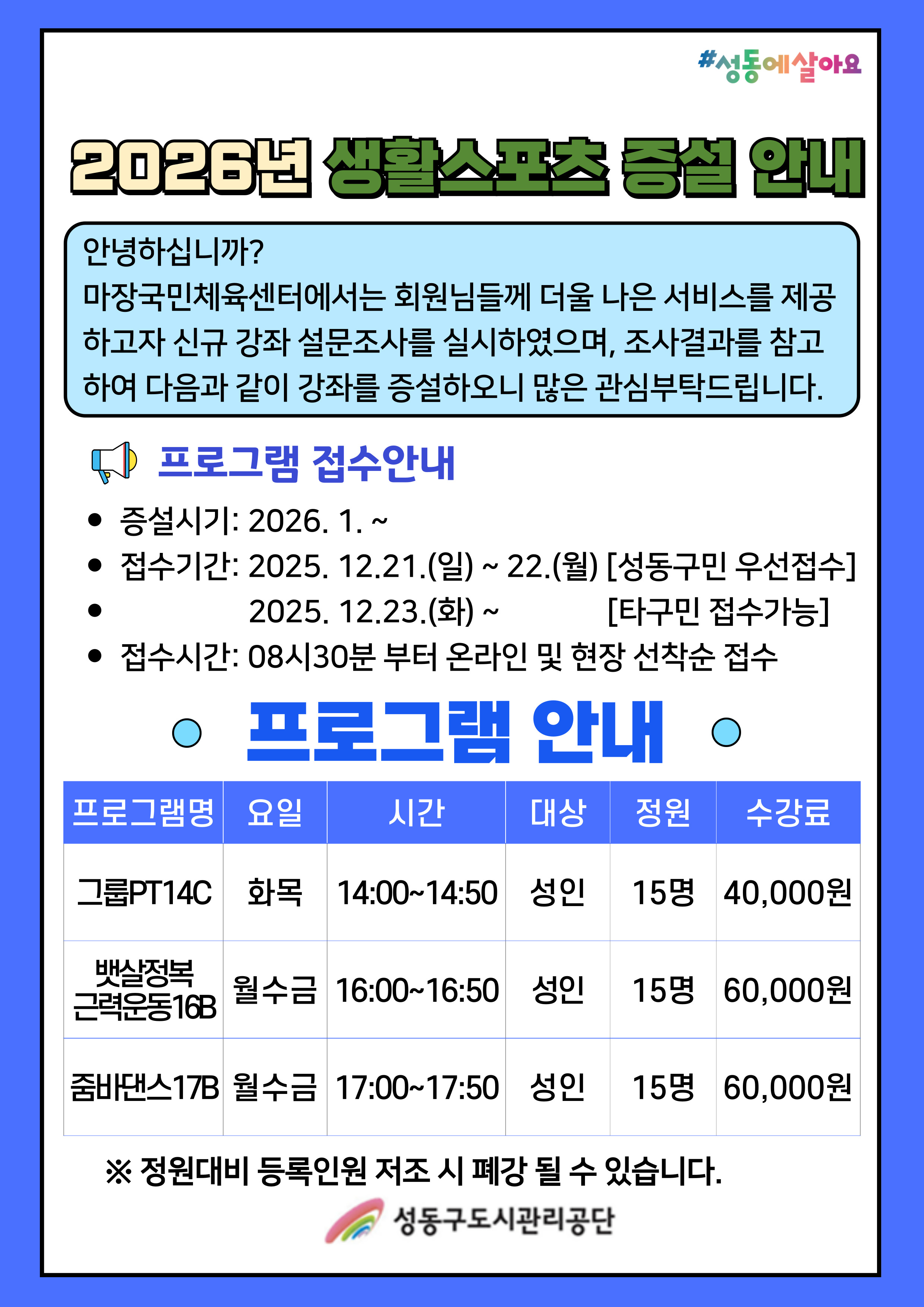 공지 마장국민체육센터 [마장국민체육센터]2026년 상반기 스포츠 강좌 증설 안내 작성자 관리자 등록일자 2025년 12월 8일 18시 27분 6초 조회 1,031 2026년 생활스포츠 증설 안내문.jpg [ Size : 956.07KB , Down : 55 ] 미리보기 다운로드 2026년 소그룹 수영 강좌 증설 안내.jpg [ Size : 1.18MB , Down : 39 ] 미리보기 다운로드 목록보기