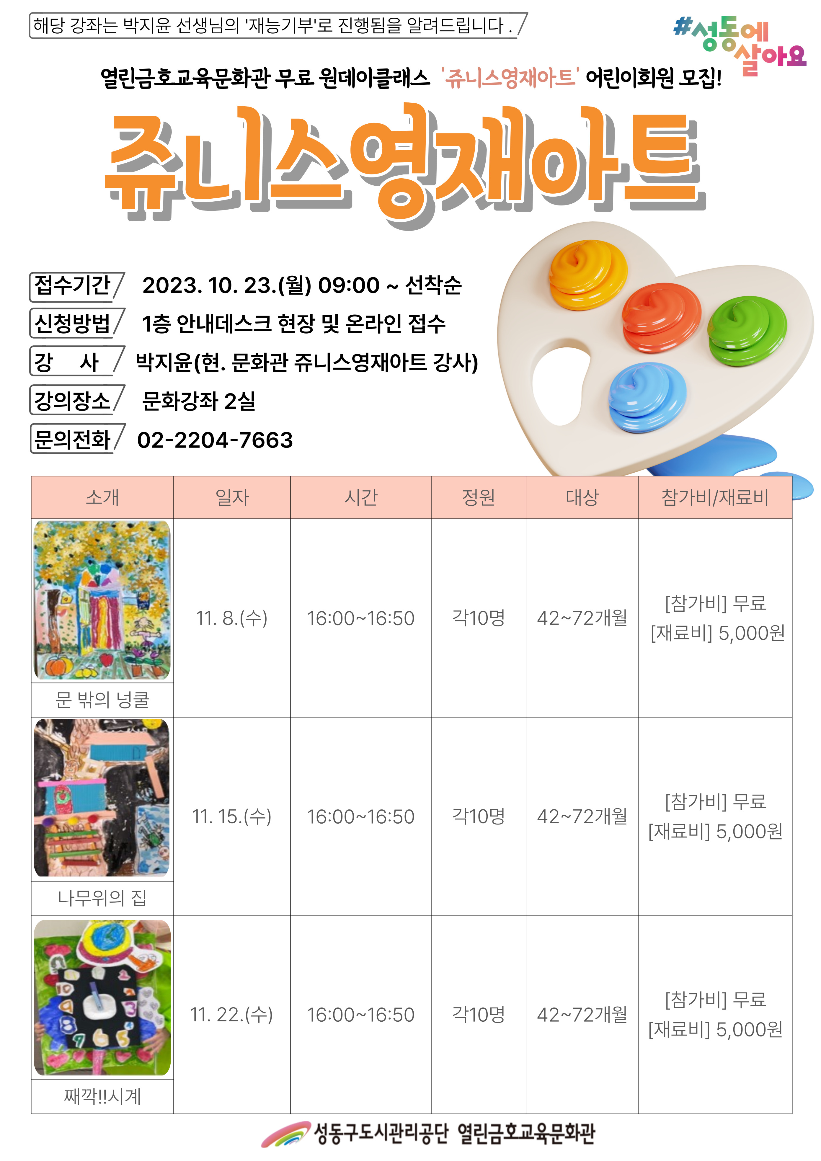 열린금호교육문화관 [열린금호교육문화관] 쥬니스영재아트 작성자 관리자 등록일자 2023년 10월 5일 10시 47분 15초 조회 709 쥬니스영재아트 재능기부 무료강좌 안내문(11월).jpg [ Size : 1.04MB , Down : 659 ] 미리보기 다운로드 목록보기