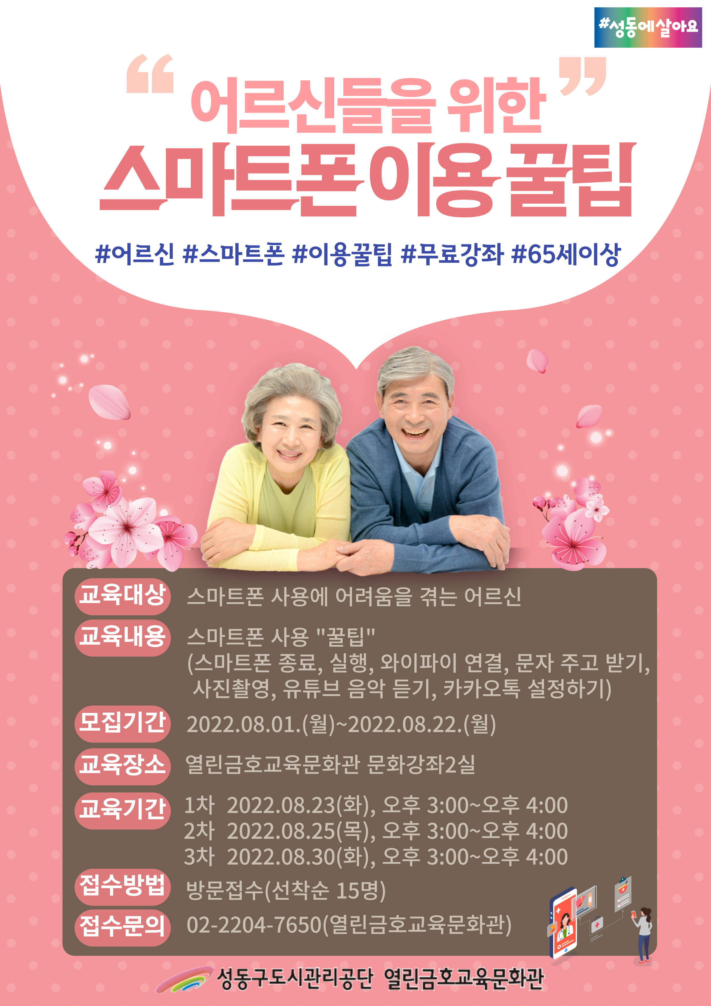 열린금호교육문화관 [열린금호교육문화관]어르신들을 위한 스마트폰 이용 꿀팁 강좌 모집 작성자 관리자 등록일자 2022년 8월 10일 11시 30분 48초 조회 636 어르신들을 위한 스마트폰 이용 꿀팁(8월).jpg [ Size : 1.01MB , Down : 525 ] 미리보기 다운로드 목록보기