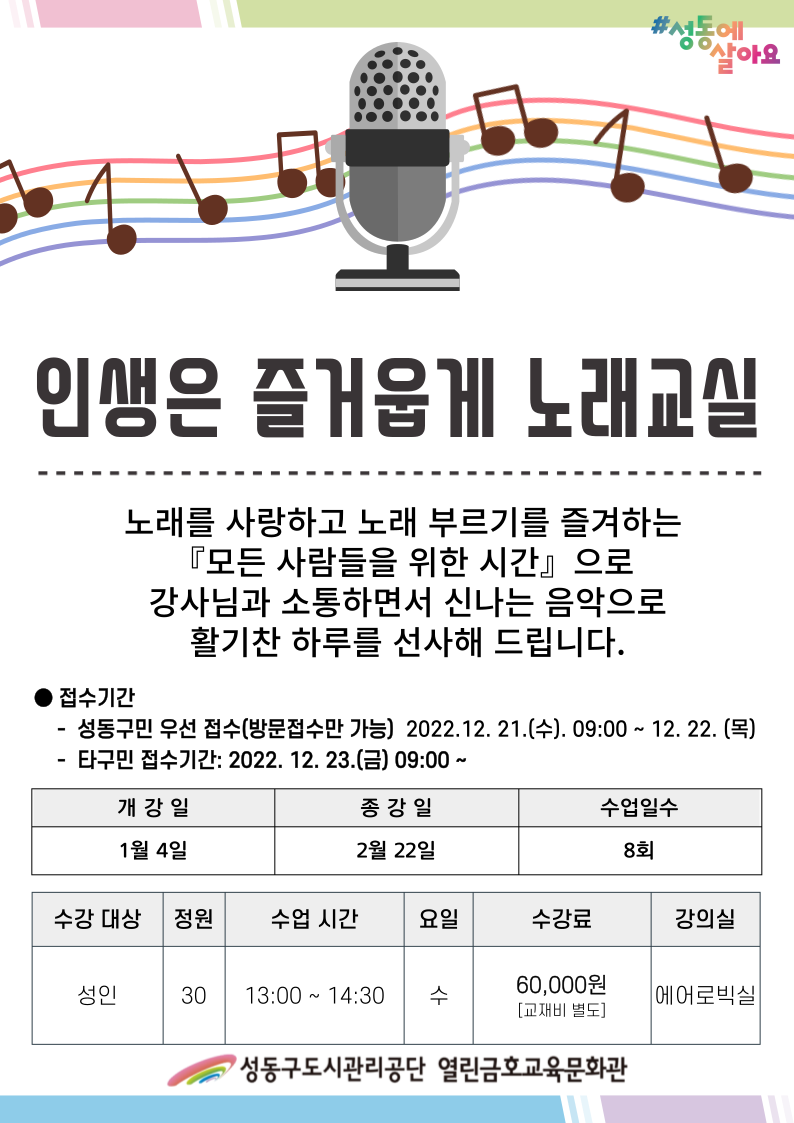 열린금호교육문화관 [열린금호교육문화관] 인생은 즐거웁게 노래교실 운영 회원모집 작성자 관리자 등록일자 2022년 12월 14일 10시 22분 19초 조회 1,037 ▶ 겨울학기 문화강좌 수강신청 바로가기 인생은 즐거웁게 노래교실.jpg [ Size : 190.33KB , Down : 987 ] 미리보기 다운로드 목록보기