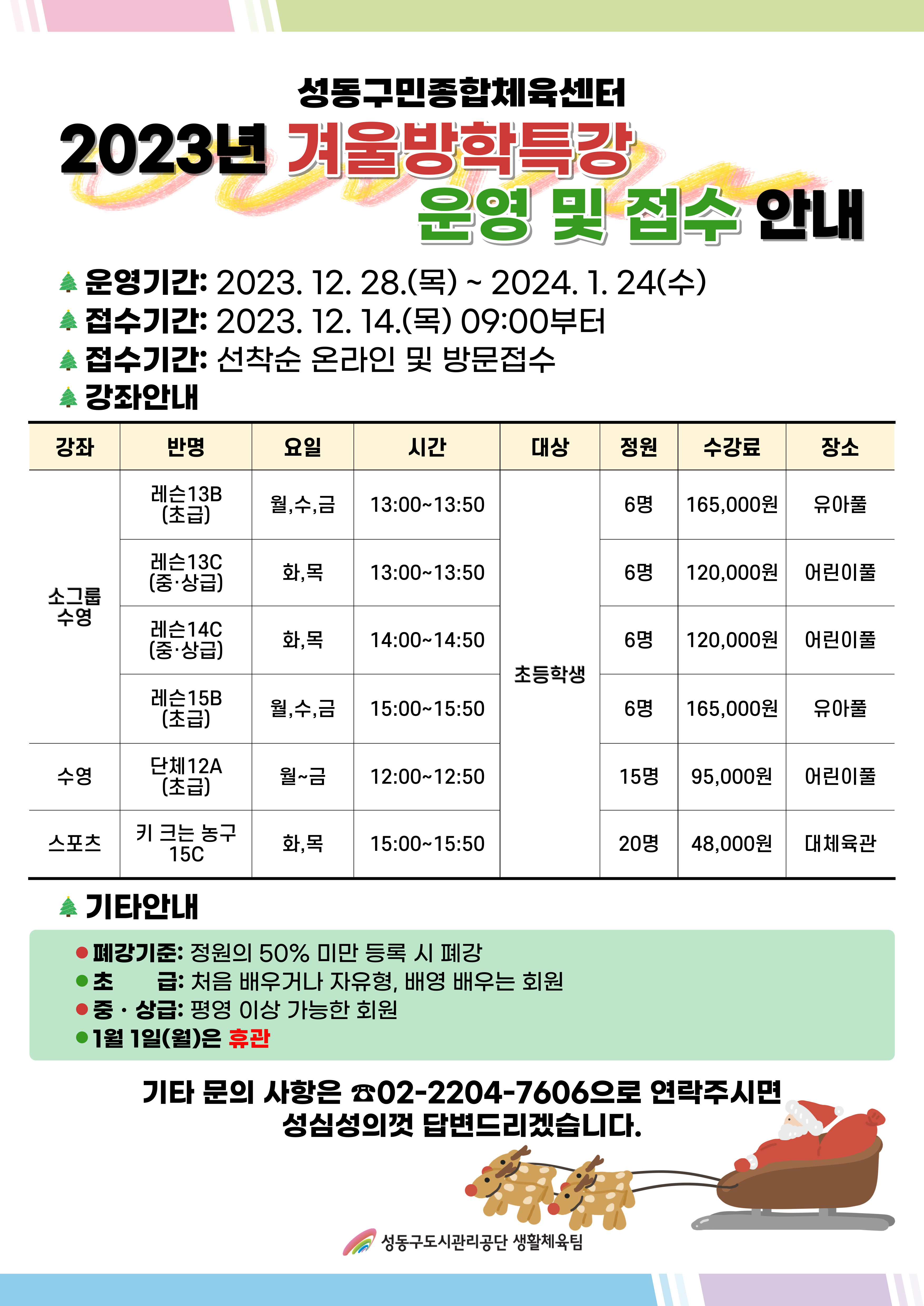 성동구민종합체육센터 [성동구민종합체육센터]2023년 겨울방학특강 안내(수정) 작성자 관리자 등록일자 2023년 11월 14일 17시 42분 13초 조회 1,700 23겨울방학특강-001.jpg [ Size : 1.41MB , Down : 406 ] 미리보기 다운로드 목록보기