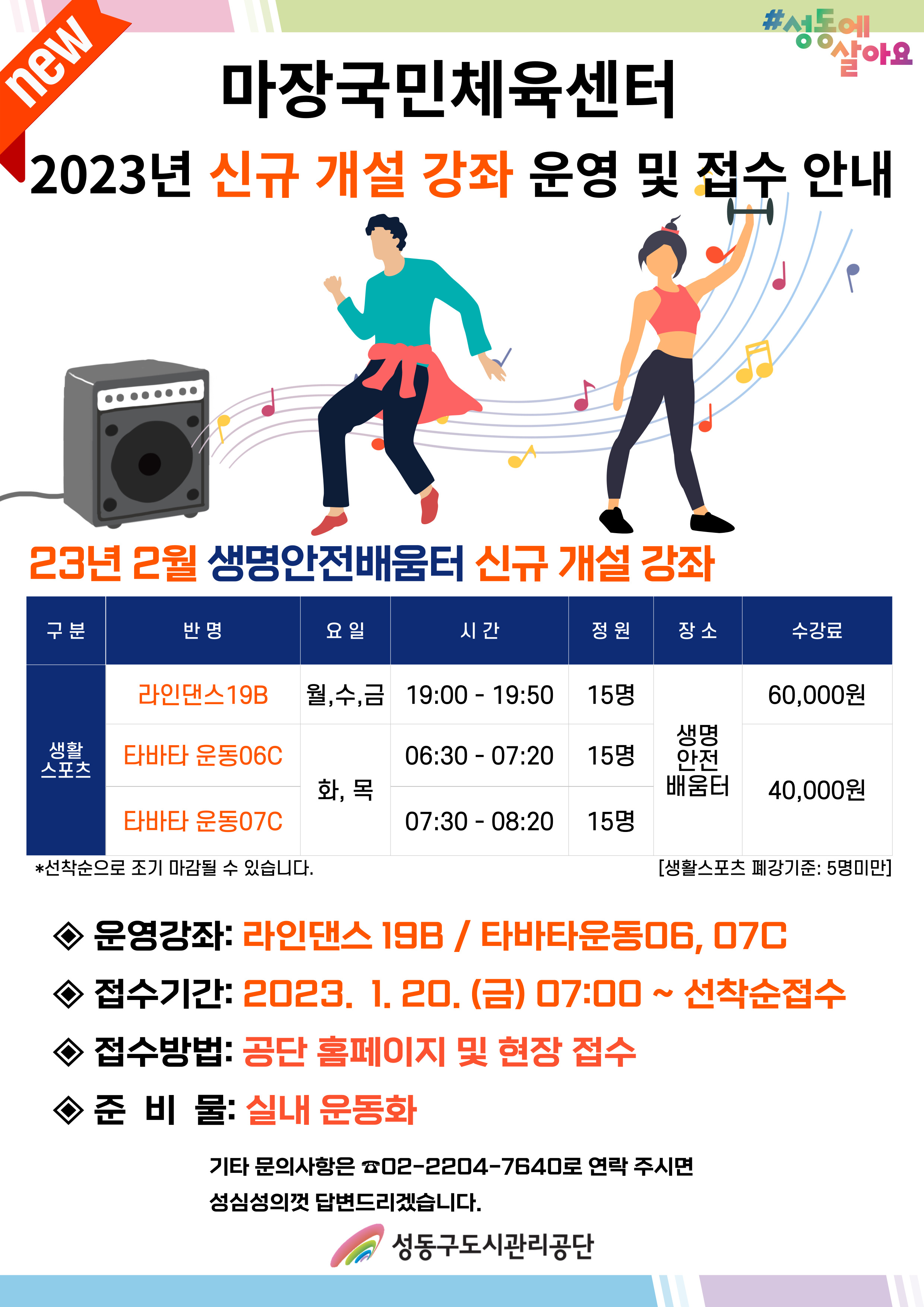 마장국민체육센터 [마장국민체육센터] 2023년 2월 신규 강좌 라인댄스, 타바타운동 운영 및 접수 안내