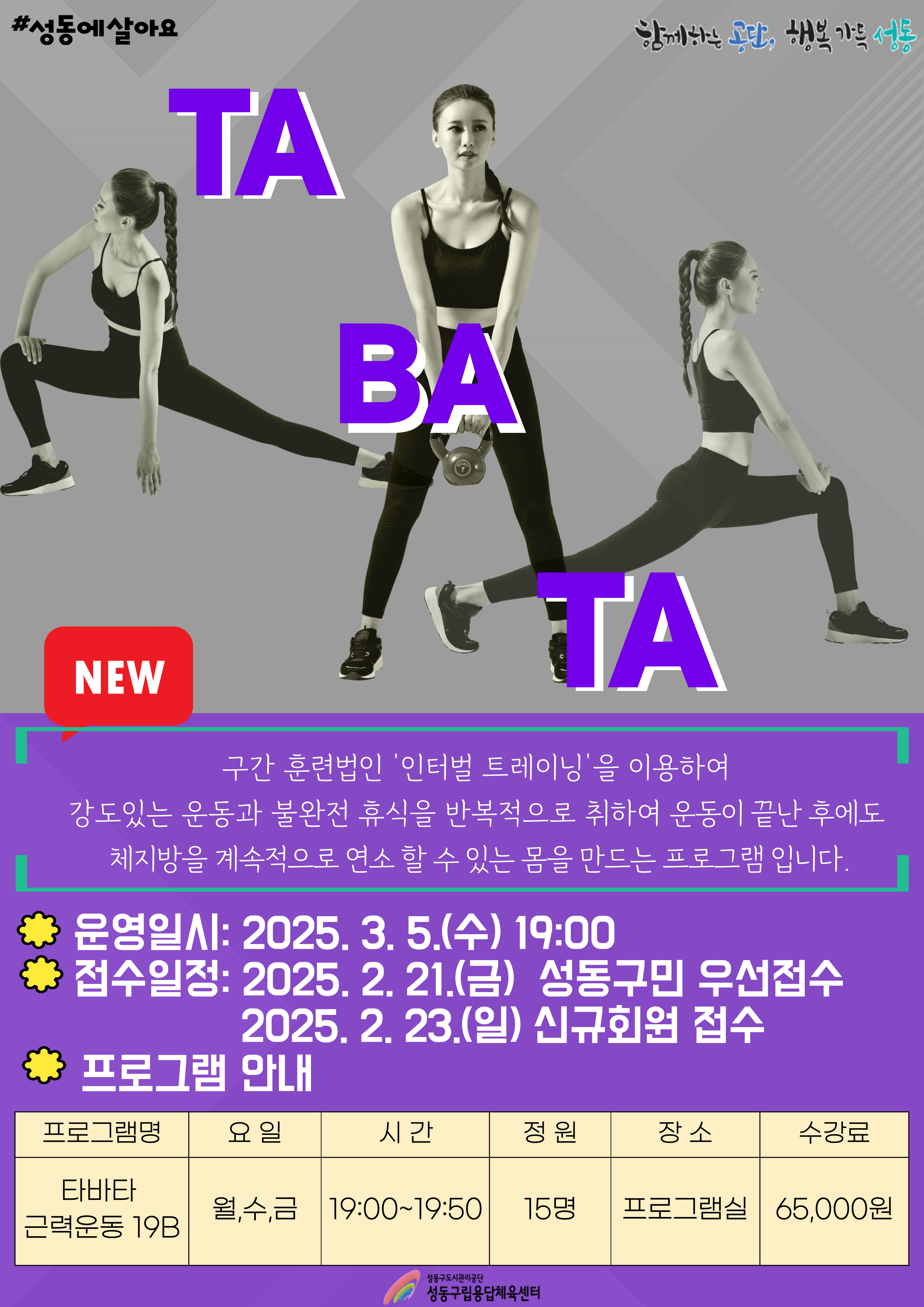 공지 성동구립용답체육센터 [용답체육센터] 타바타 근력운동 19B 증설 안내 작성자 관리자 등록일자 2025년 2월 10일 17시 54분 36초 조회 538 타바타(홍보물).jpg [ Size : 1.08MB , Down : 537 ] 미리보기 다운로드 목록보기