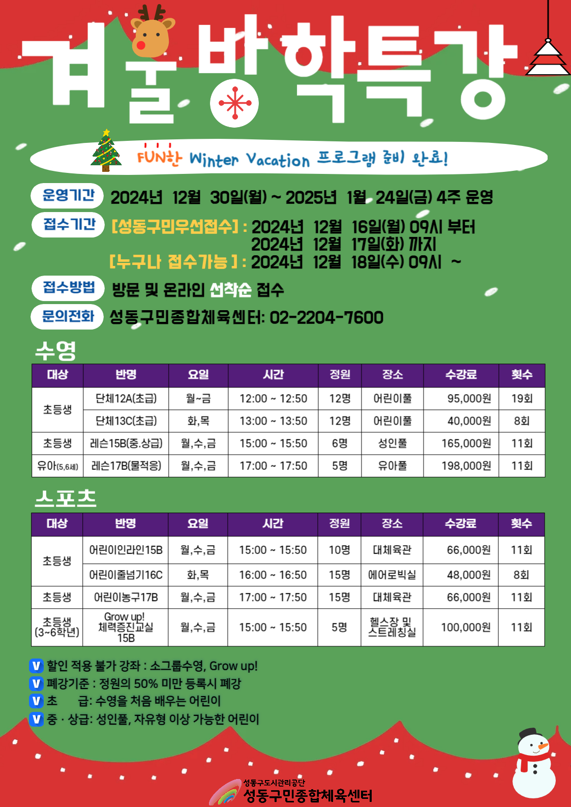 성동구민종합체육센터 [성동구민종합체육센터] 2024년 겨울방학특강 프로그램 안내 작성자 관리자 등록일자 2024년 12월 6일 16시 20분 55초 조회 2,489 ▶ 겨울방학특강 수강신청 바로가기: https://lrl.kr/uv2H 2024년 방학특강-001.jpg [ Size : 810.93KB , Down : 3,206 ] 미리보기 다운로드 목록보기