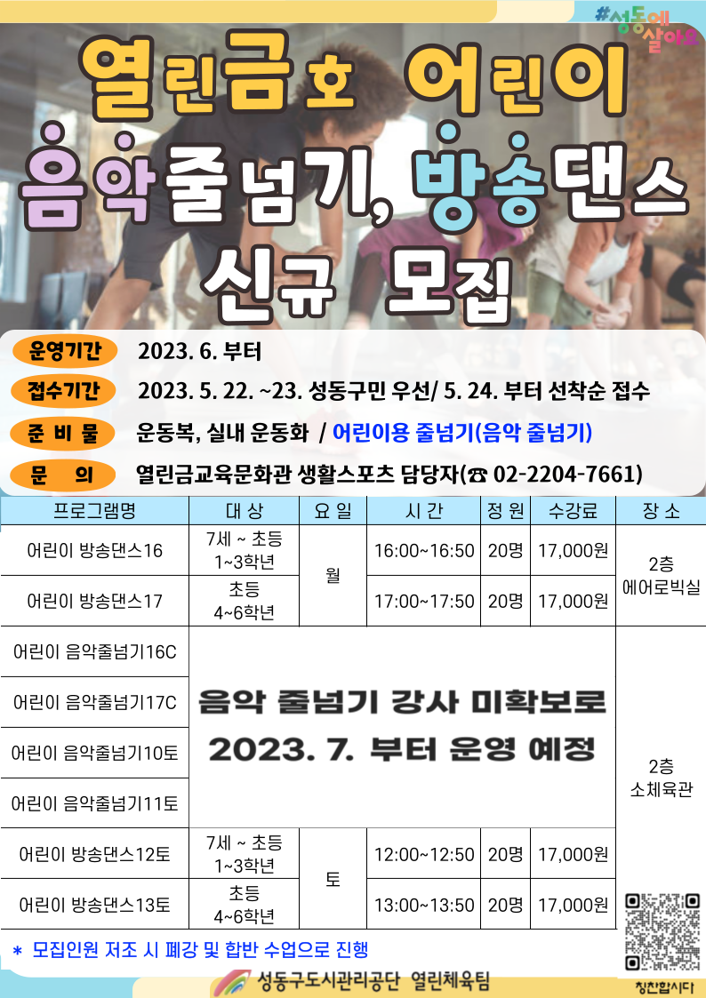열린금호교육문화관 열린금호 어린이 음악줄넘기, 방송댄스 모집 작성자 관리자 등록일자 2023년 5월 9일 10시 43분 59초 조회 754 열린금호교육문화관 음악 줄넘기, 방송댄스 안내문(수정).png [ Size : 528.82KB , Down : 613 ] 미리보기 다운로드 목록보기