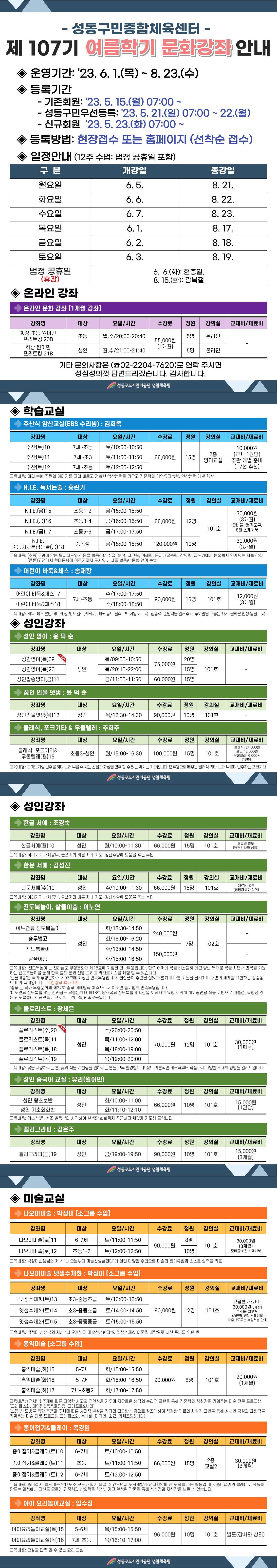 성동구민종합체육센터 [성동구민종합체육센터] 107기 여름학기 문화강좌 안내 작성자 관리자 등록일자 2023년 5월 3일 9시 24분 51초 조회 1,817 107기여름학기문화강좌.jpg [ Size : 1.71MB , Down : 2,067 ] 미리보기 다운로드 목록보기