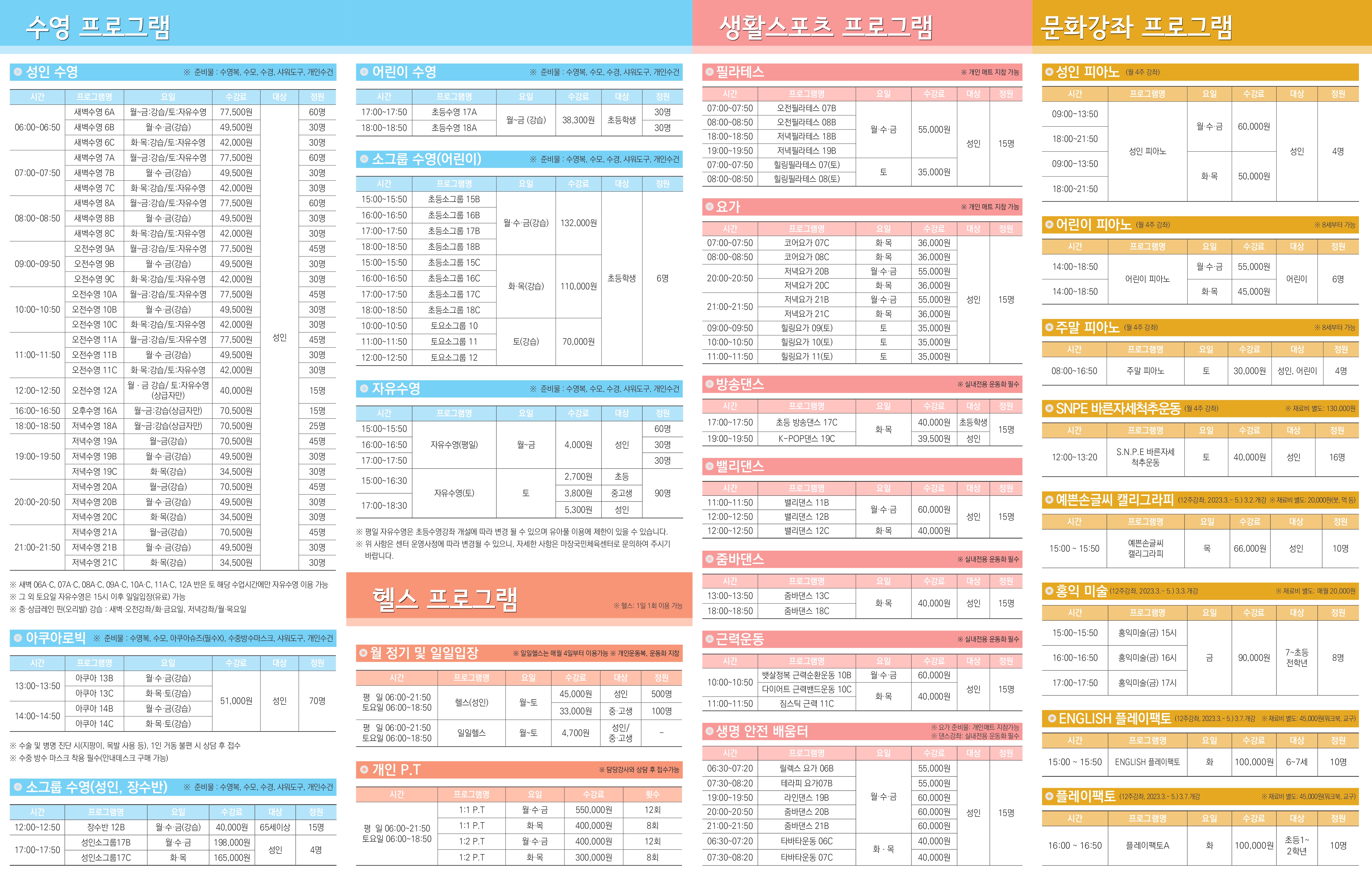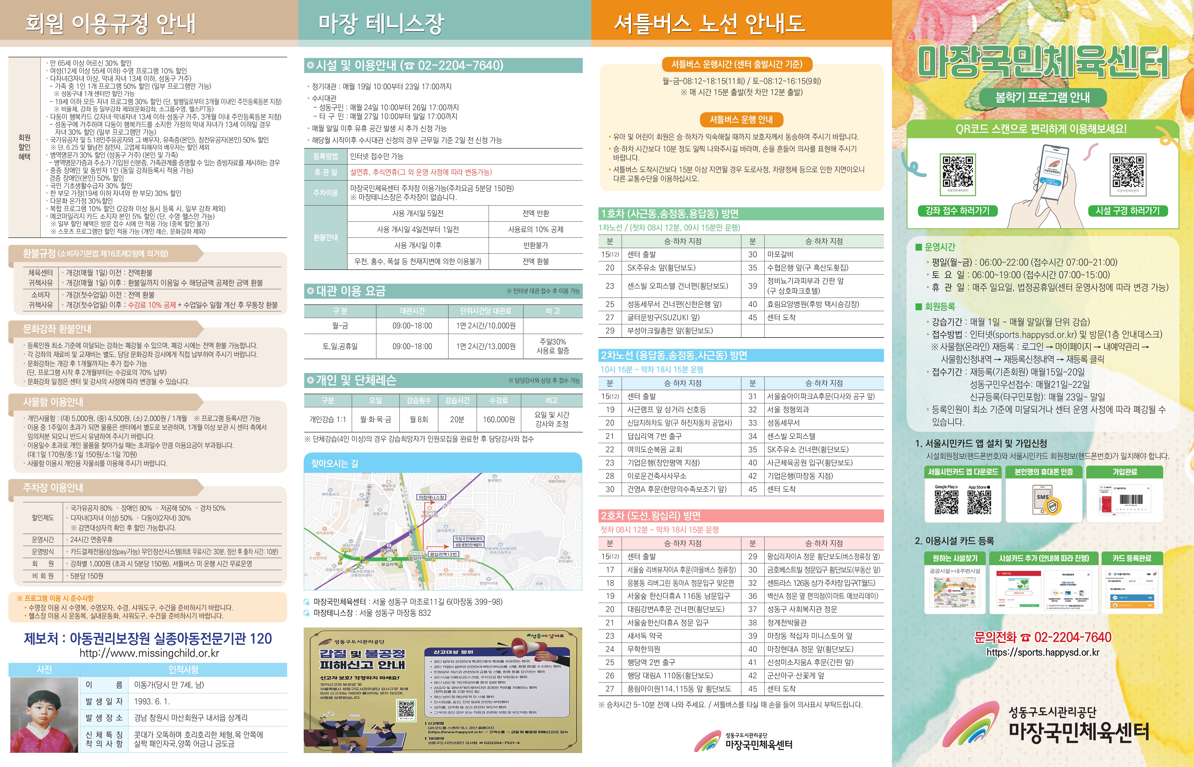 마장국민체육센터 마장국민체육센터 3월~7월 프로그램 안내 작성자 관리자 등록일자 2023년 6월 21일 15시 47분 2초 조회 1,176 마장 프로그램 전단지1.jpg [ Size : 6.33MB , Down : 1,646 ] 미리보기 다운로드 마장 프로그램 전단지2.jpg [ Size : 4.69MB , Down : 1,752 ] 미리보기 다운로드 목록보기