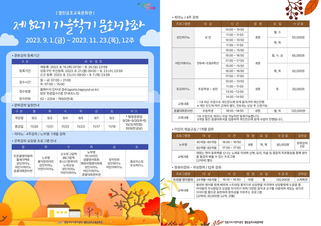 열린금호교육문화관 문화강좌 여름학기(9월~11월) 전단지 작성자 관리자 등록일자 2023년 8월 24일 15시 46분 28초 조회 815 1.JPG [ Size : 186.72KB , Down : 888 ] 미리보기 다운로드 2.JPG [ Size : 238.88KB , Down : 856 ] 미리보기 다운로드 목록보기