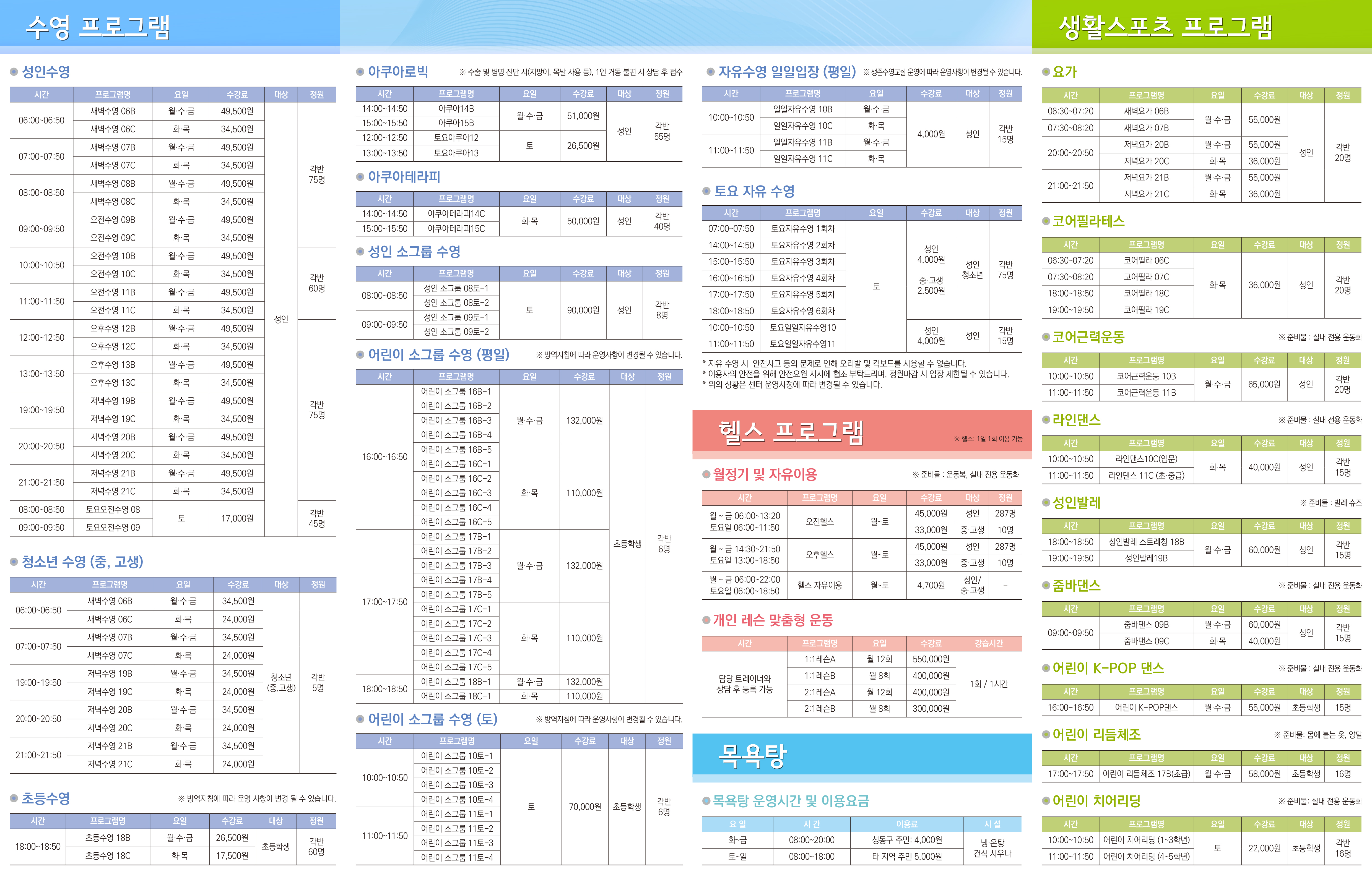 성동구립용답체육센터 봄학기(3월~5월) 프로그램 리플렛 작성자 관리자 등록일자 2022년 3월 22일 9시 11분 46초 조회 1,188 프로그램 리플렛-1.JPG [ Size : 6.51MB , Down : 1,784 ] 미리보기 다운로드 프로그램 리플렛-2.JPG [ Size : 4.93MB , Down : 1,647 ] 미리보기 다운로드 목록보기