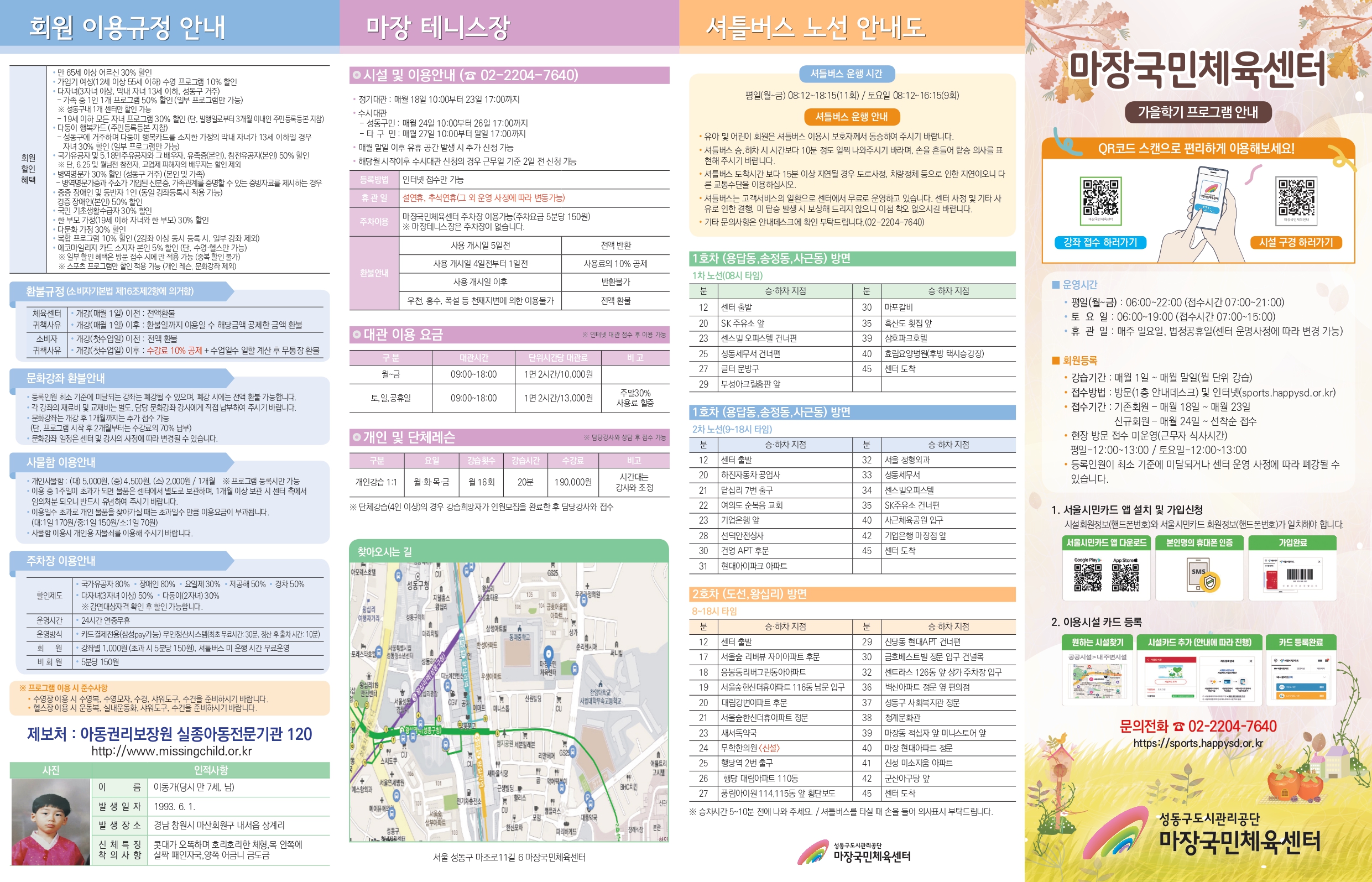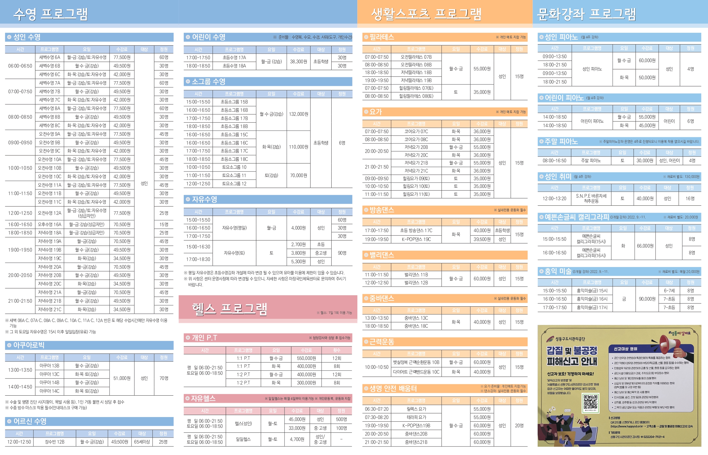 마장국민체육센터 가을학기(9월~11월) 프로그램 리플릿 작성자 관리자 등록일자 2022년 9월 16일 19시 59분 14초 조회 1,279 마장 리플릿1.jpg [ Size : 2.22MB , Down : 1,961 ] 미리보기 다운로드 마장 리플릿2.jpg [ Size : 1.88MB , Down : 1,874 ] 미리보기 다운로드 목록보기