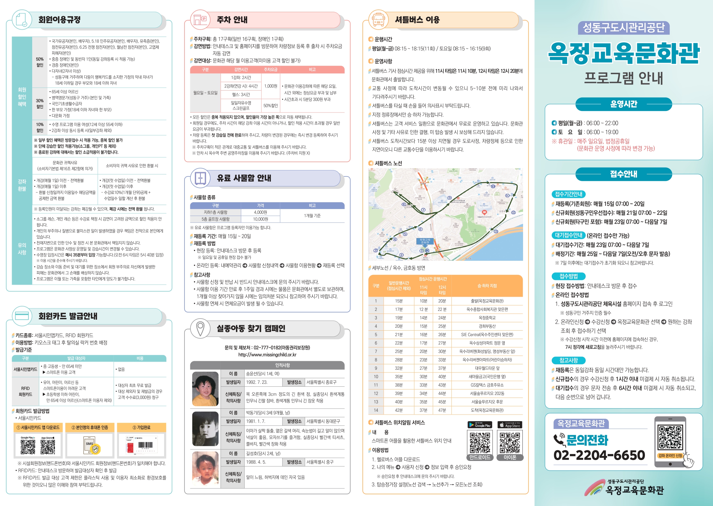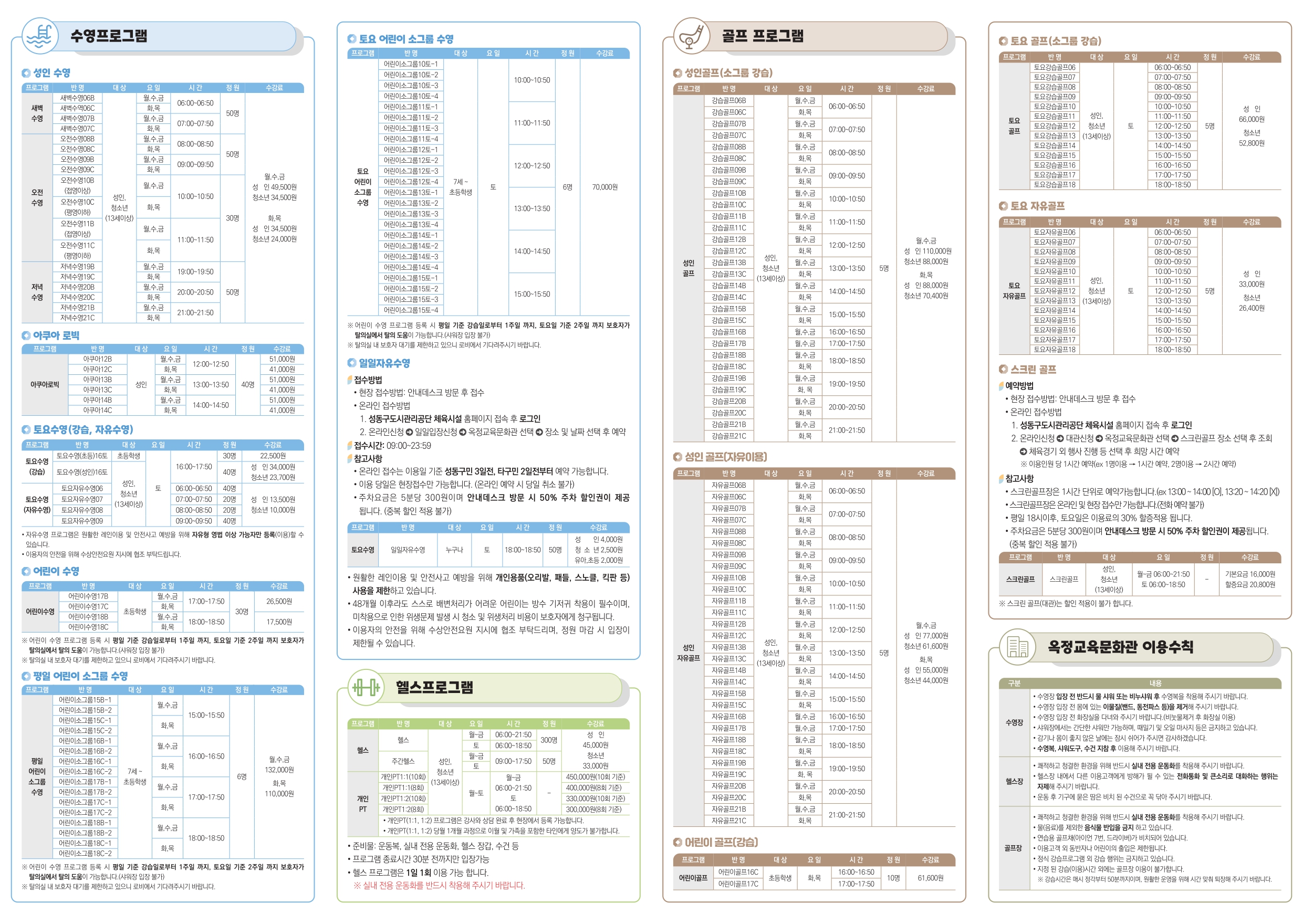 옥정교육문화관 [옥정교육문화관] 수영, 헬스, 골프 프로그램 안내 작성자 관리자 등록일자 2025년 7월 22일 14시 49분 12초 조회 543 2025년 옥정교육문화관 프로그램 리플릿 2025년 옥정교육문화관 프로그램 리플릿 1.jpg [ Size : 2.01MB , Down : 403 ] 미리보기 다운로드 2025년 옥정교육문화관 프로그램 리플릿 2.jpg [ Size : 2MB , Down : 361 ] 미리보기 다운로드 목록보기