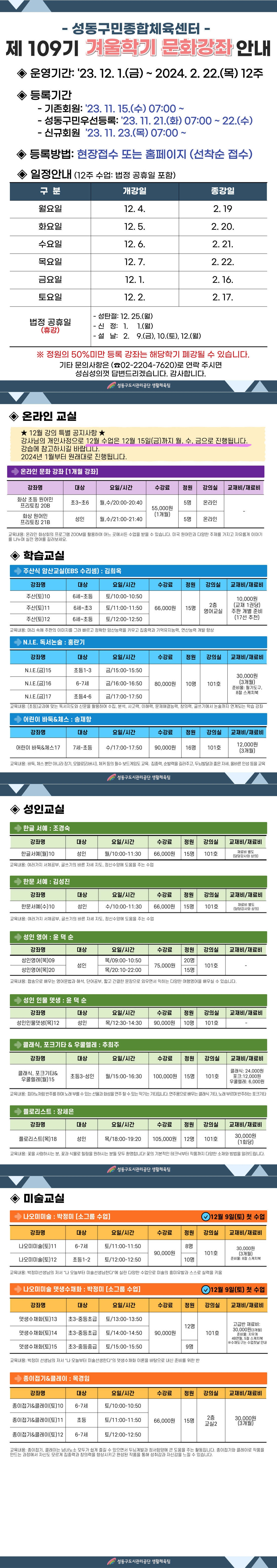 성동구민종합체육센터 [성동구민종합체육센터] 109기 겨울학기(12월~2월) 문화강좌 안내 작성자 관리자 등록일자 2023년 11월 6일 13시 48분 53초 조회 1,781 109기-겨울학기-문화강좌.jpg [ Size : 1.42MB , Down : 1,996 ] 미리보기 다운로드 목록보기