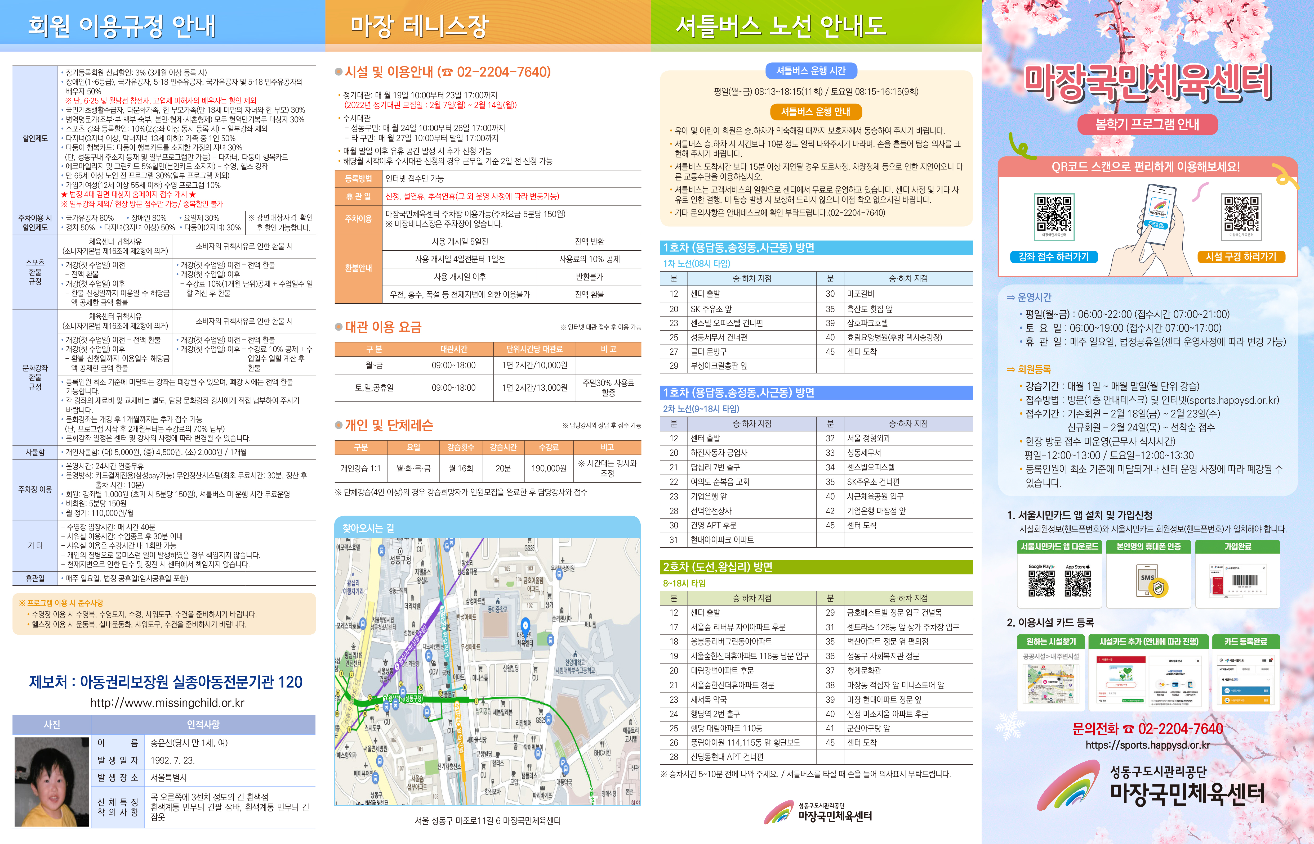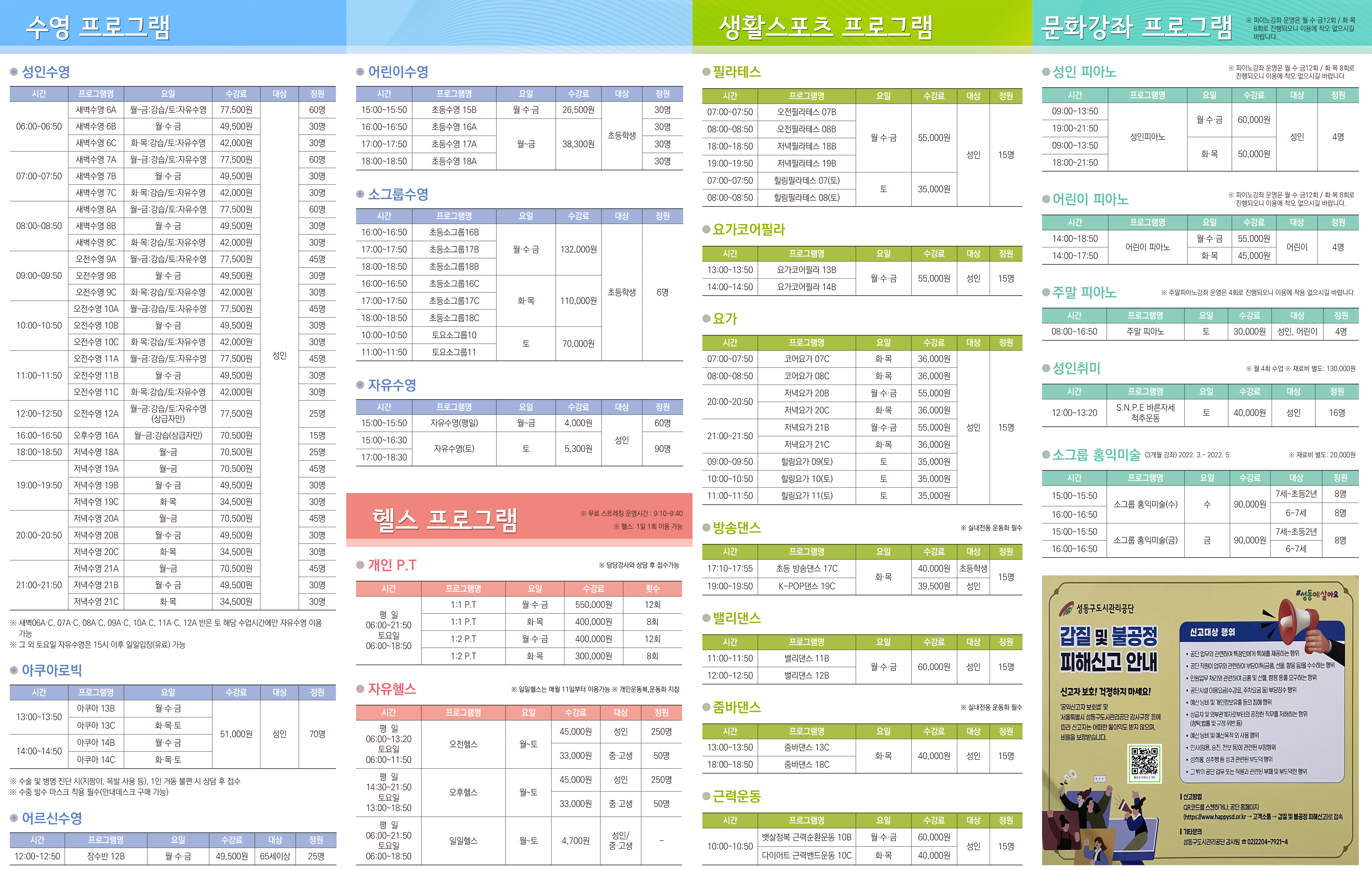 마장국민체육센터 봄학기(3월~5월) 프로그램 리플렛 작성자 관리자 등록일자 2022년 3월 21일 17시 8분 41초 조회 1,151 프로그램 리플렛1.JPG [ Size : 7.9MB , Down : 1,577 ] 미리보기 다운로드 프로그램 리플렛2.JPG [ Size : 5.4MB , Down : 1,610 ] 미리보기 다운로드 목록보기